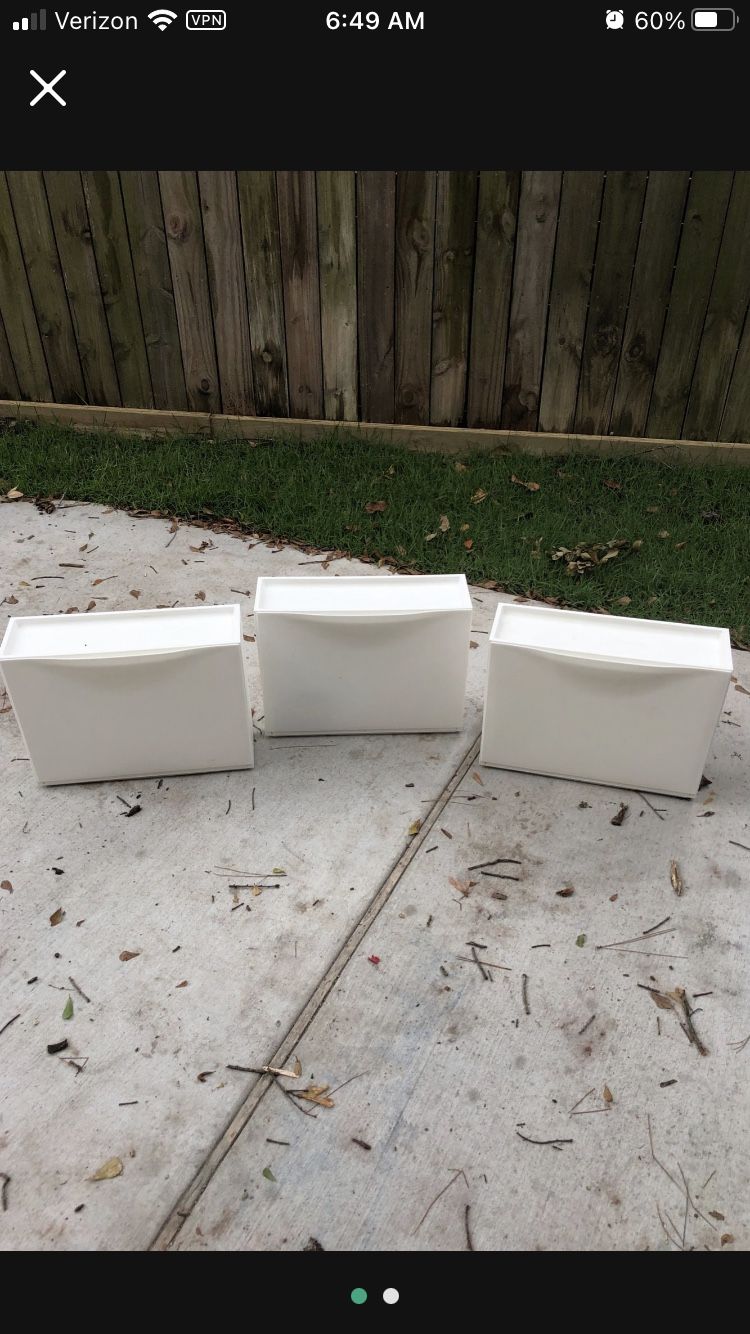 They are plastic and measure 20” wide 15” tall and 6.5” deep. Great for books, magazines, kids toys
