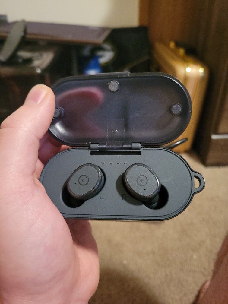 Wireless Bluetooth earbuds with USB charger works good its a touch actived device hold button to turn on and off one Tap to pause