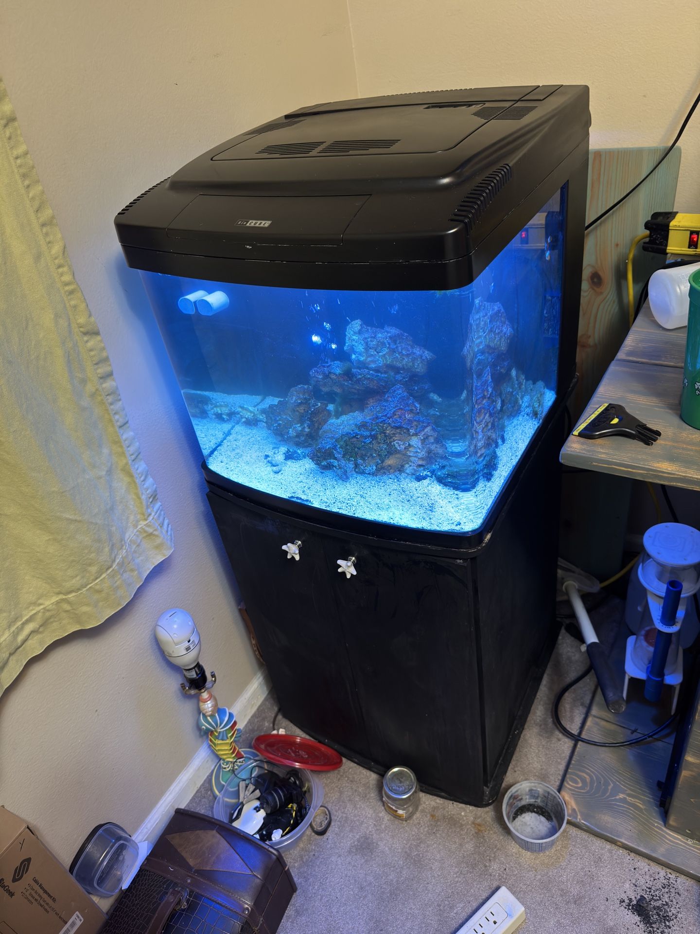 29-gallon Coral Life Bio Cube up for grabs. Currently still up and running, but not for long. Should be down within the next day or two, maybe sooner. The cube is in great shape. Only a couple of scratches you can barely see at the right angle. Awesome new tank for the season. Vet, or new boop personally I love the tanks with the hood after owning this one. Total game changer. Way less trips for RO water. As far as extra items, not too many. I do believe there’s a heater within the tank, no pump. So you will receive the tank with the hood and Hybrid lights, bio balls, and I believe I have a couple of new extra filters unopened for you with the stand. Just so you know, no pump, no sand, no live rock.