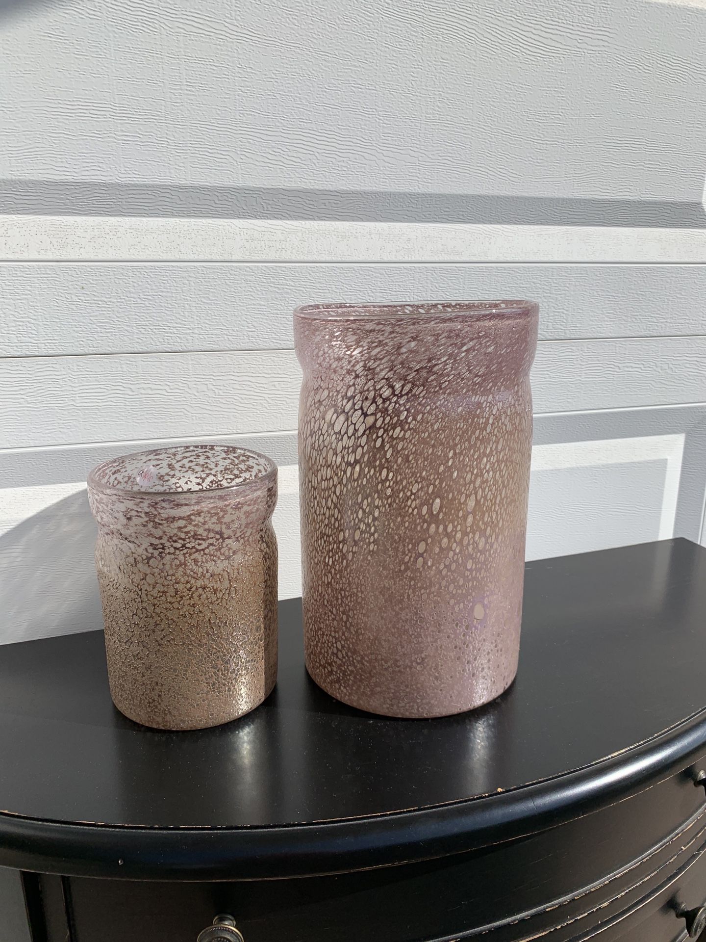 Never been used, price tags still on from fine linen store. Can be sold separate or together. Have 2 large and 1 small size. Glass with a purple/pink hue. Great for plants and flowers or a stand alone art piece. 2 Large each: $35 Small: $15