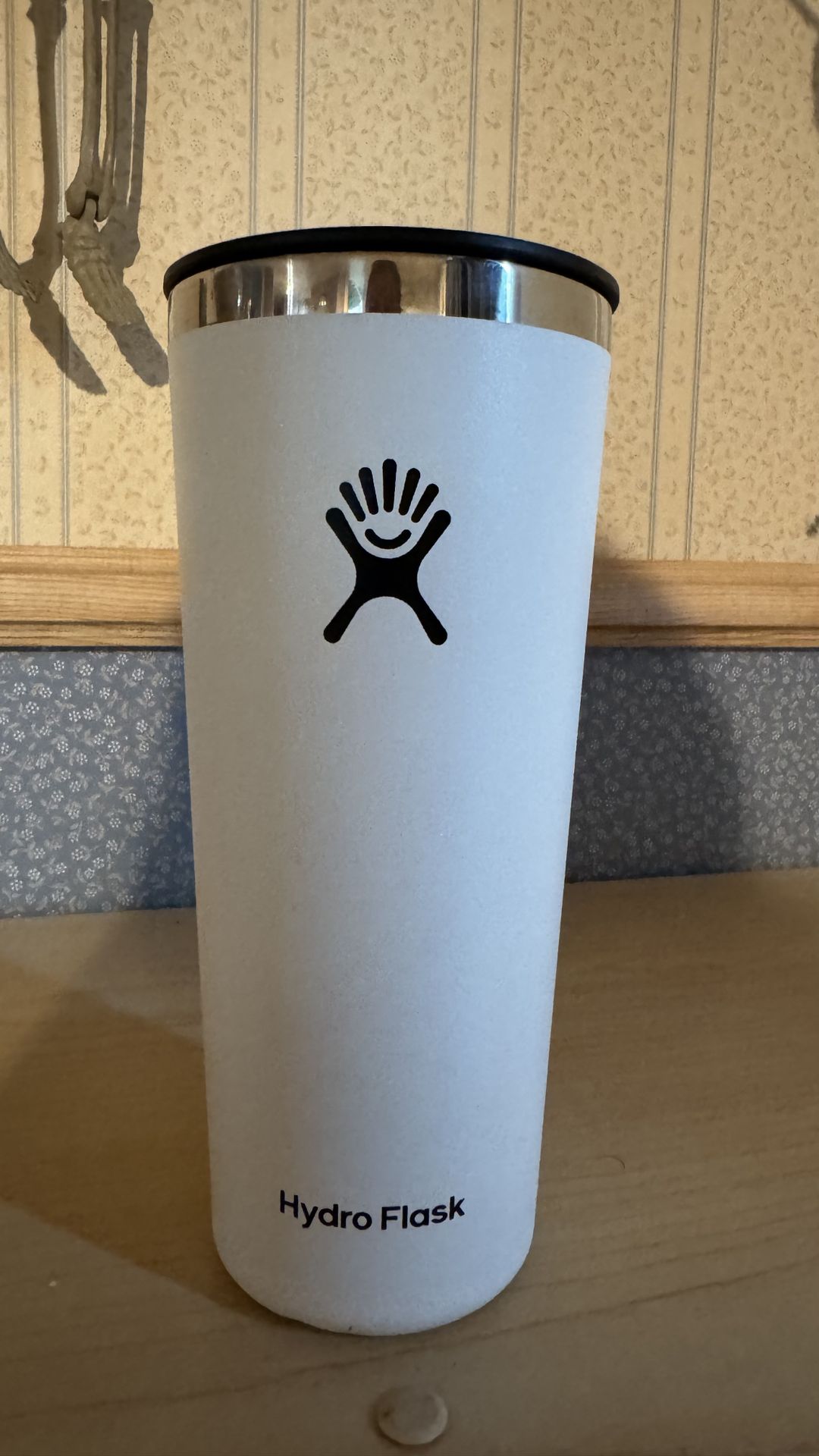 White Hydroflask coffee tumbler. Has small dents on the bottom