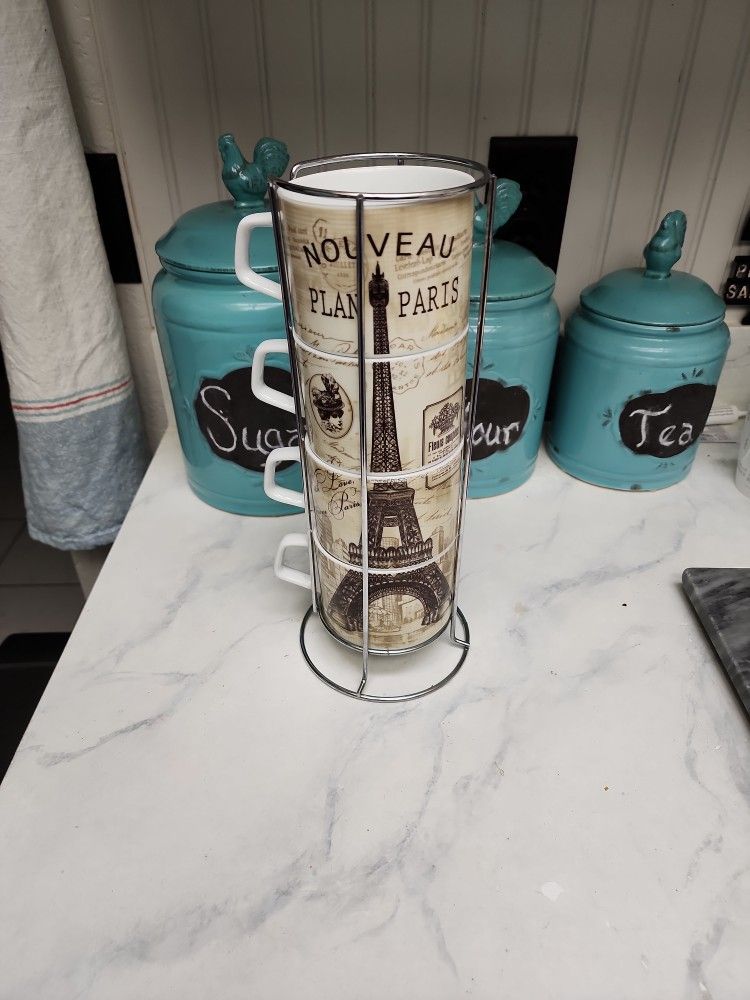 4 stackable cups cups with the Eiffel tower from Paris. Dishwasher and microwavable. Like new, never used.