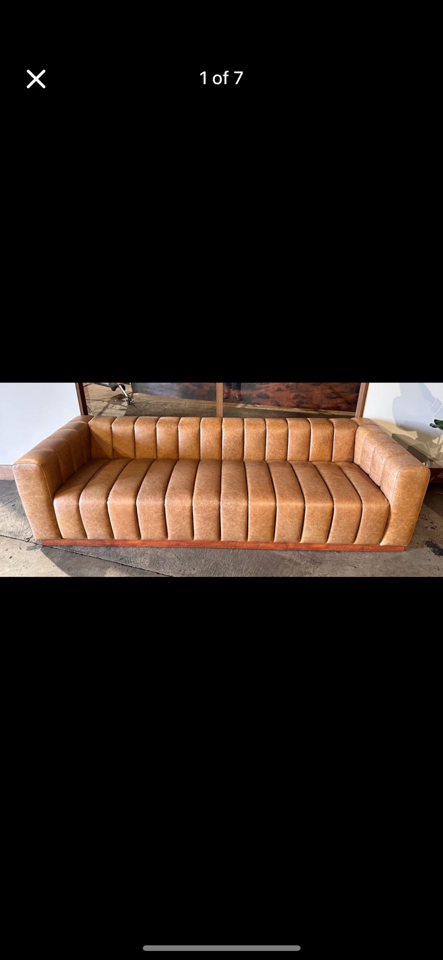 CB2 Forte 101" Extra-Large Channeled Saddle Leather Sofa with Wood Base Brand New Sat on for about 10 minutes for a photo shoot. Retails for $3199 Asking $2800 OBO Details Cushy channels of rich saddle-colored top-grain leather line the length of this generous sofa by Mermelada Estudio. Soft to the touch with a sit on the firmer side, this unexpectedly deep sofa is comfy enough to really stretch out. Low profile wood base with dark walnut stain brings added warmth to this vintage Italian modern statement piece. Learn about Mermelada Estudio on our blog. CB2 exclusive. Designed by Mermelada Estudio 100% buffalo aniline-dyed leather in saddle Wood frame with dark walnut stain Each piece will vary due to the natural leather Leather will age and soften over time with natural variations in color and markings Leather cleaner or conditioner may be used Clean with soft, dry cloth; blot spills immediately Keep out of direct sunlight to prevent fading OVERALL DIMENSIONS Width: 101" Depth: 38.75" Height: 26.5" SEAT Width: 83.5" Depth: 26" Height: 16"