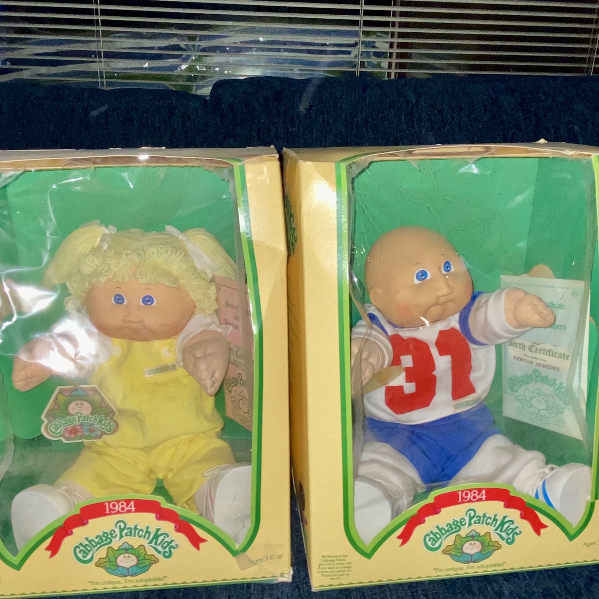 Two Cabbage Patch Dolls 1984 Cabbage Patch Kids were a big hit in the 80’s. These are collectibles. I am selling these two together. They have never been removed from their boxes. The girl has the last name “Leanor “. I am unable to see her first name without taking her out of the box. Ms. Leanor is wearing a pretty yellow jumpsuit and a white top underneath. Her white shoes have pink stripes on them. Her blonde hair is in ponytails. Her eyes are blue. Her box has a couple mini tears on the front. The plastic cover on the front of the box is partially unstuck. The boy is named “Kenton Zebedee”. He is wearing a sport shirt. He has white sweatpants on, with blue shorts over them. He also is wearing white shoes with blue stripes on them. His eyes are blue. The plastic cover on the front of the box is partially unstuck. These Cabbage Patch Kids will bring you joy. Cash Only. Porch Pickup Have an awesome day!