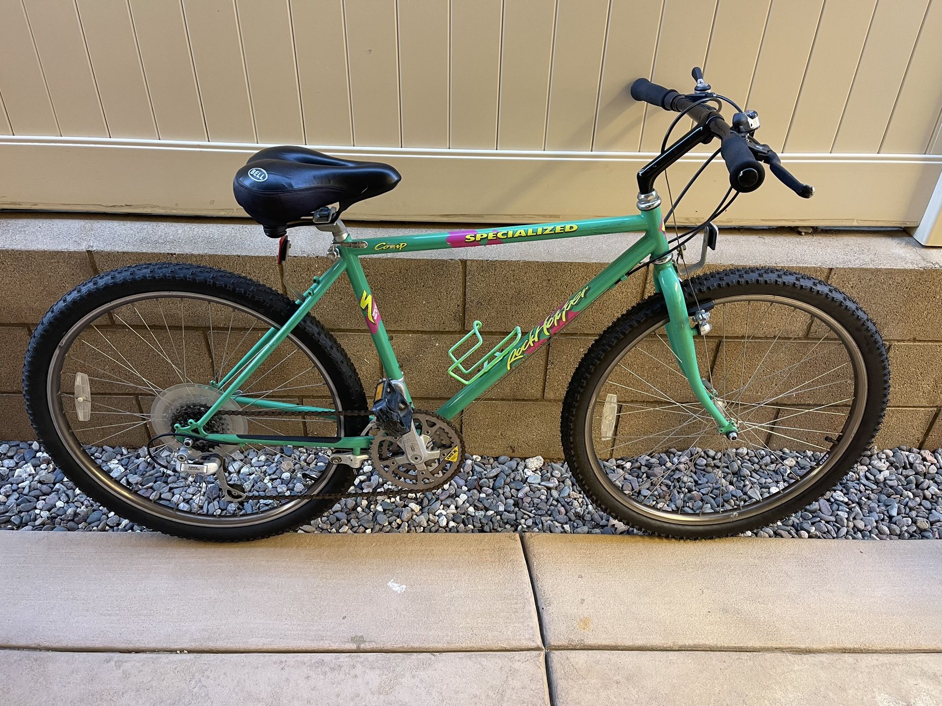 Vintage SPECIALIZED Comp Rockhopper 1988 Specialized Rockhopper Comp Di Nucci green Original Components: Frame: 21” CrMo double butted tubing, STR Seat tube reinforcement, CdMo chainstays, forged dropouts with double eyelets. Braze-ons: water bottle bosses, brake bosses, rack mount, all cable guides and stops Fork: TIG Welded Uni-crown, CrMo blades and steerer Weight: 29.4 lbs Wheels: 26″ Shimano Deore sealed hubs, Specialized GX-28 rims 26×1.5 alloy, Wheelsmith 14g dtainless spokes Tires: Specialized Hardpack, 26×2.2″ Derailleurs: Shimano Deore S.I.S. Shifters: Shimano Deore S.I.S. Crankset: Shimano Deore, Biopace, Gray anodized chainrings, 28/38/48 Bottom Bracket: Specialized CB-2E, sealed Pedals: MKS G-6000 Freewheel: Shimano Exage 6-speed, Mountain freehub, 14-16-19-22-26-30 Teeth Chain: Shimano Uniglide, black Handlebar: Specialized Team Bar, flat, black anodized Stem: Specialized MTB-3, black anodized, sized to frame Headset: Specialized, sealed mechanism Brakes: Shimano Deore front cantilevers, Deore U-brake with Sharktooth under chainstays, oversized cables in lined housing, Deore levers Seatpost: Strong alloy, 26.6mm diameter; 250mm length Saddle: Specialized Lambda & Bell Memory Foam Seat , both seats are included . Equipped with SHIMANO DEORE parts. Serious buyers “ONLY” please!! Asking :$1,500.00- OBO