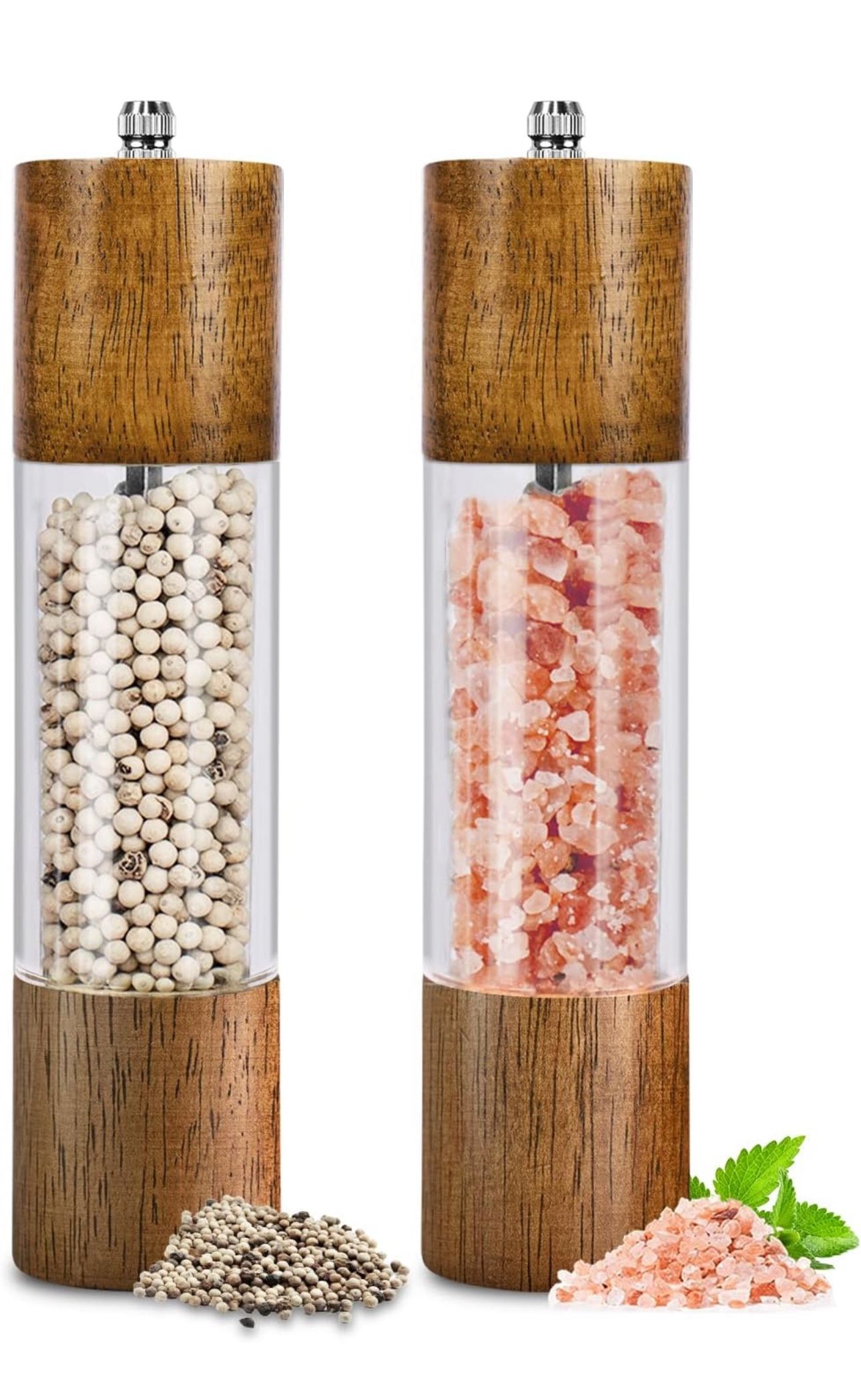 🔥Brand new🔥 2 Pack Salt and Pepper Grinder Set, Premium Acrylic Salt and Pepper Mills - Manual Oak Wooden Shakers with Adjustable Ceramic Core-8 Inc