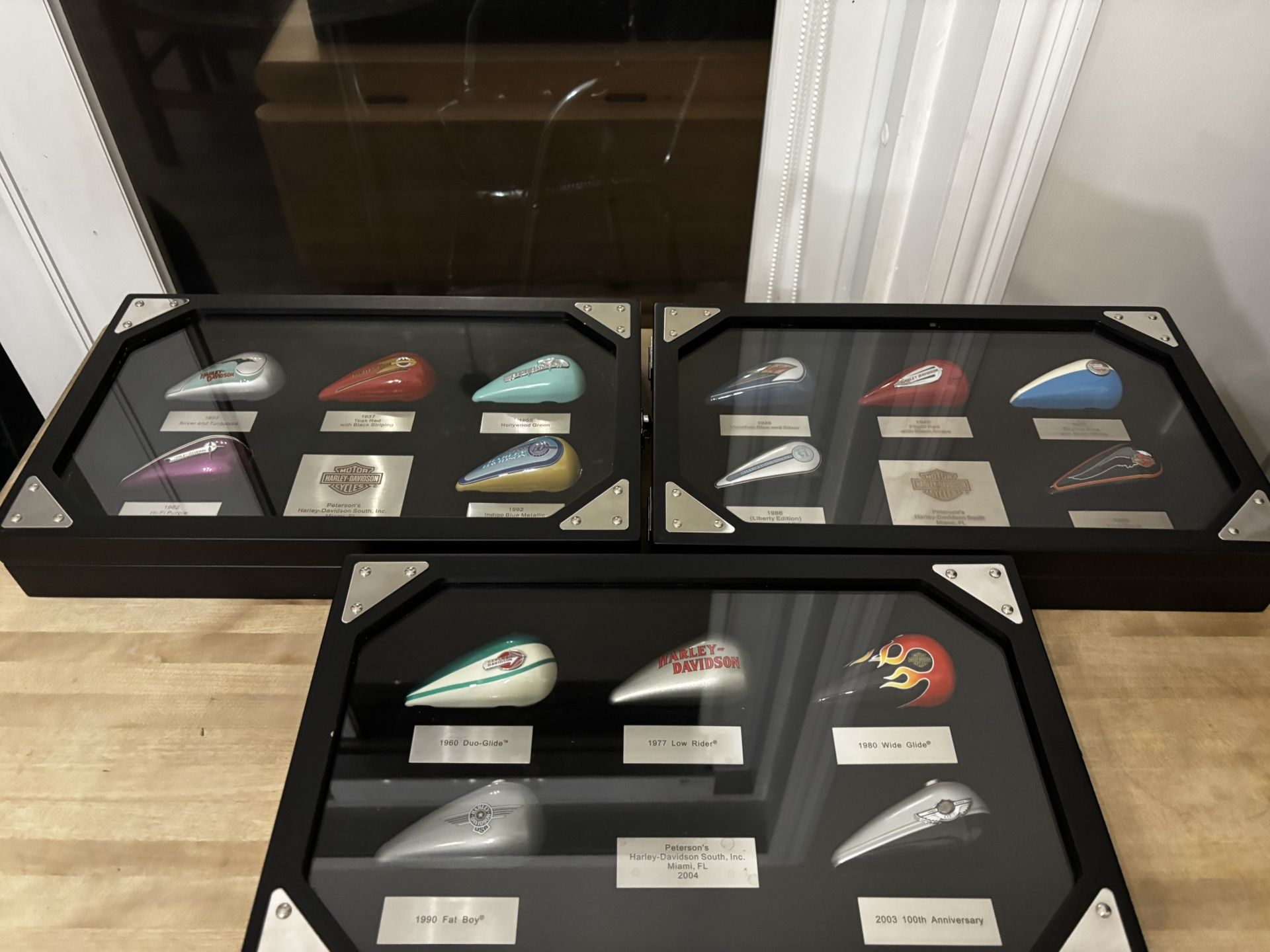 Set of Harley-Davidson miniature gas tank collectibles in glass shadow boxes. Features classic models like the Duo-Glide, Low Rider, Wide Glide, Fat Boy, and 100th Anniversary editions. Dealership commemorative pieces from Peterson’s Harley-Davidson (2004). Excellent condition — no damage, looks great on the wall or shelf. Perfect for Harley fans, collectors, or garage décor. Selling as a set. Serious buyers only.