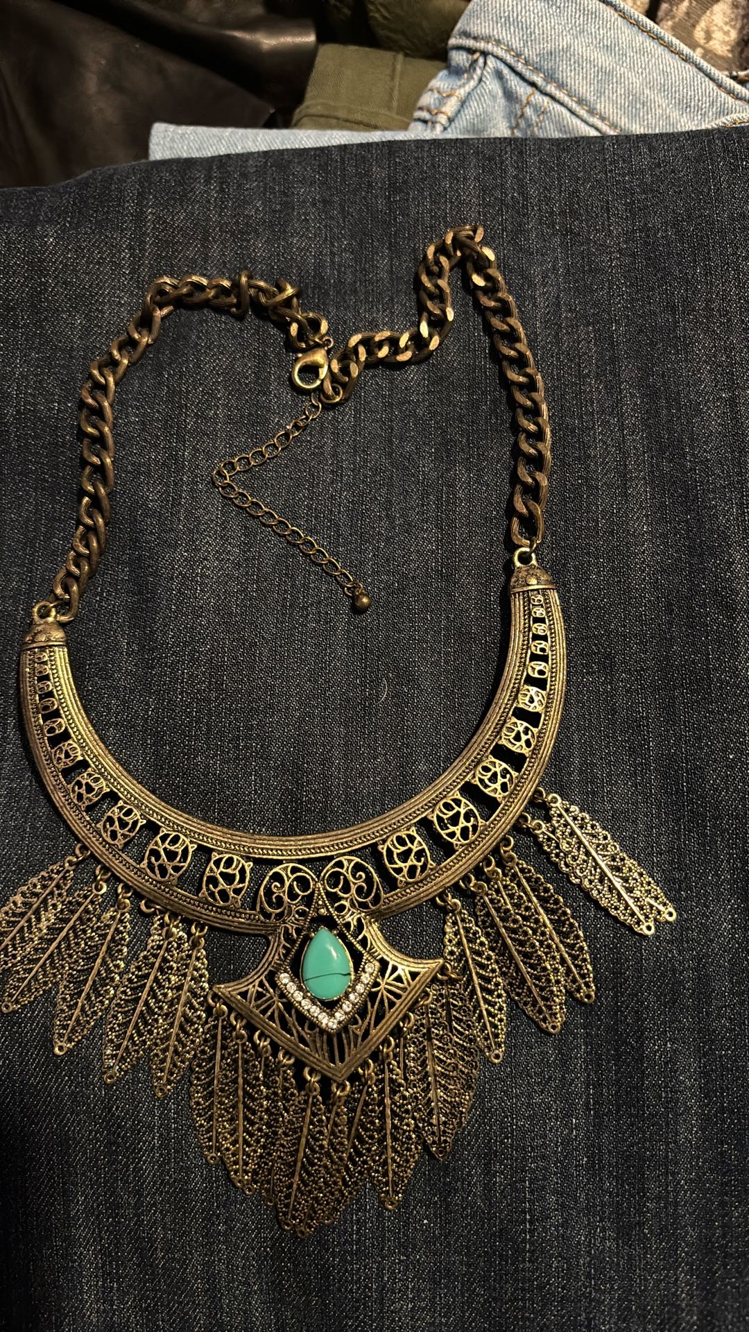 Bohemian Statement STYLE Womens Necklace Feather Turquoise Gems Small horizontal crack in gem. See pic