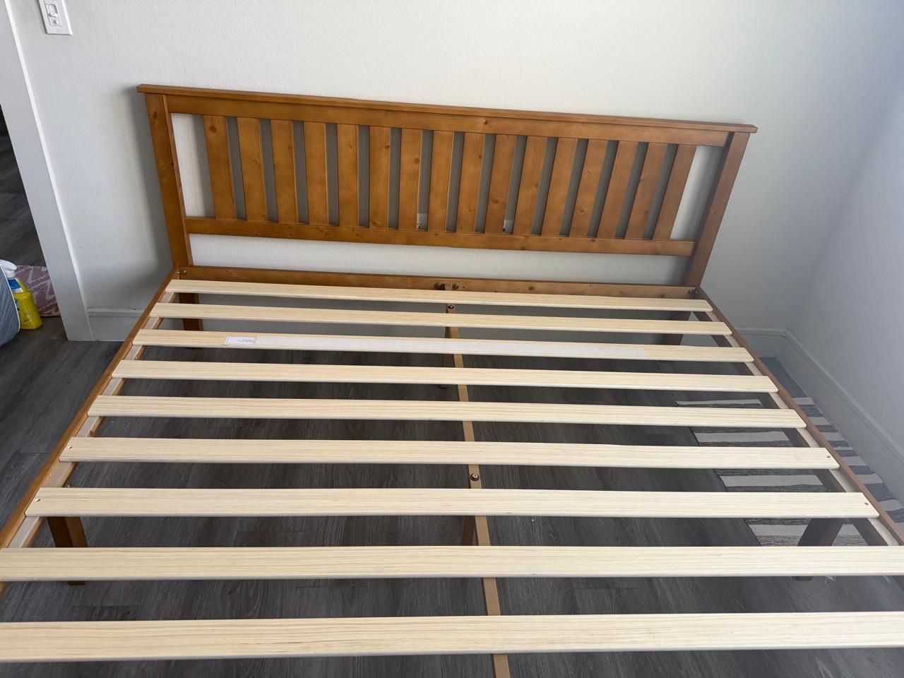 Solid Wood Platform Bed with Paneled Headboard, Natural Pine, King Original price: $350 Mattress is available for sale separately. Excellent condition. Minimal Use. Smoke free home. No pets! • Solid Pine Wood: Solid wood platform bed made with real Pine wood in a beautiful, natural finish • Modern Design: Modern design with a wooden paneled headboard • Sturdy Support: Full, Queen, and King sizes include additional steel legs in the center for sturdy and lasting support • Noise-Free Stability: Made to be noise-free with velvet padding between the center bar and wooden slats • Non-Slip Slats: Non-slip tape on the wooden slats helps keep your mattress safely in place • Under Bed Storage: High profile platform bed with 10 inches of under bed storage space • Easy Assembly: Easy assembly, no additional tools required • Lasting Support: Classic wooden slats provide lasting support without the need for a separate box spring