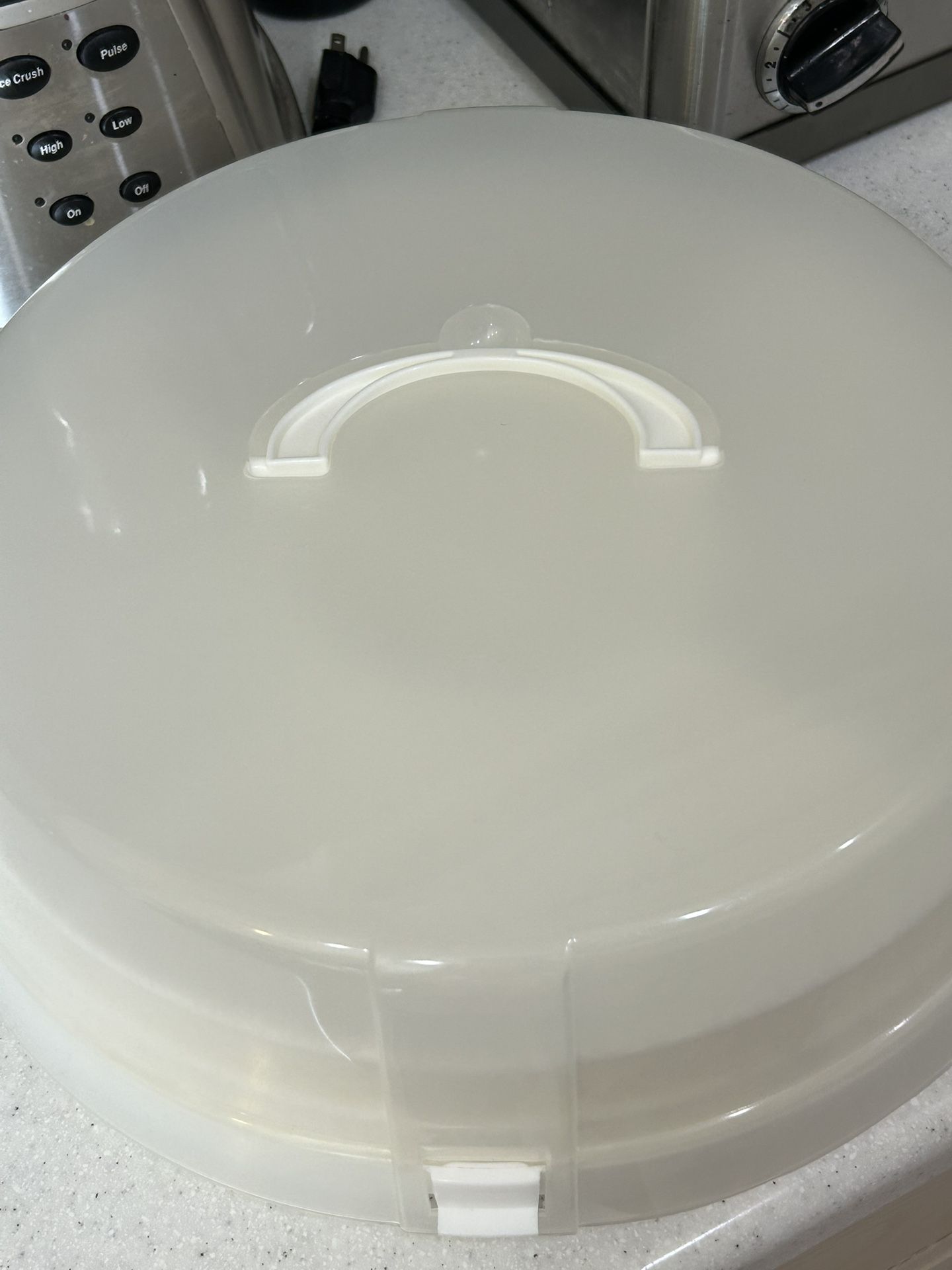 Round, multi-purpose carrier. Perfect for transporting cake, cupcakes, deviled eggs, veggies & dip,… All pieces fit in the carrier for easy storage. New - unpacked but never used. See photos for dimensions.