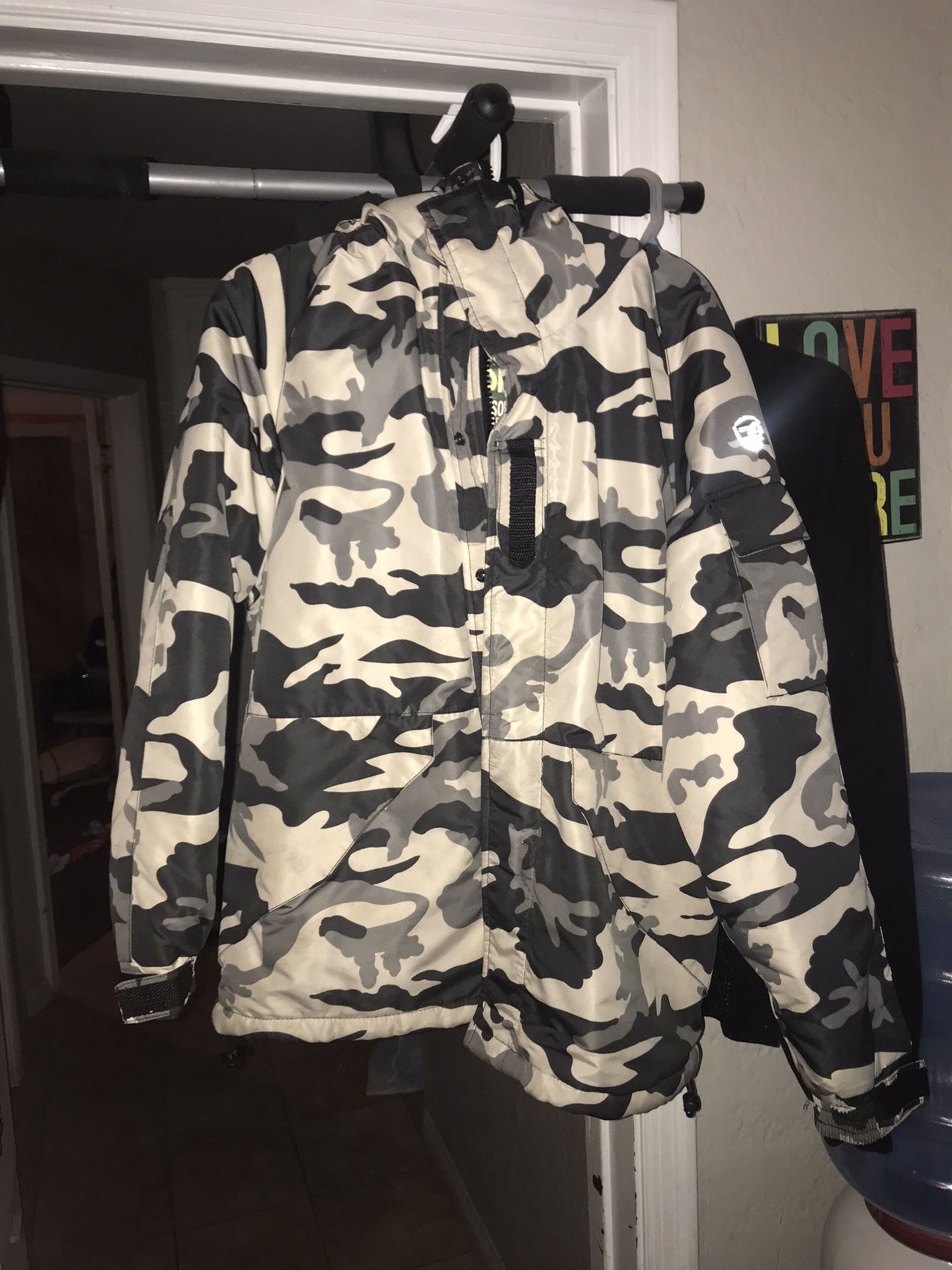 White camo snow jacket for sale. Jacket is super warm. I have worn this in some heavy snow and it kept me dry and it kept me warm. Can’t beat the price. Cash only no trades