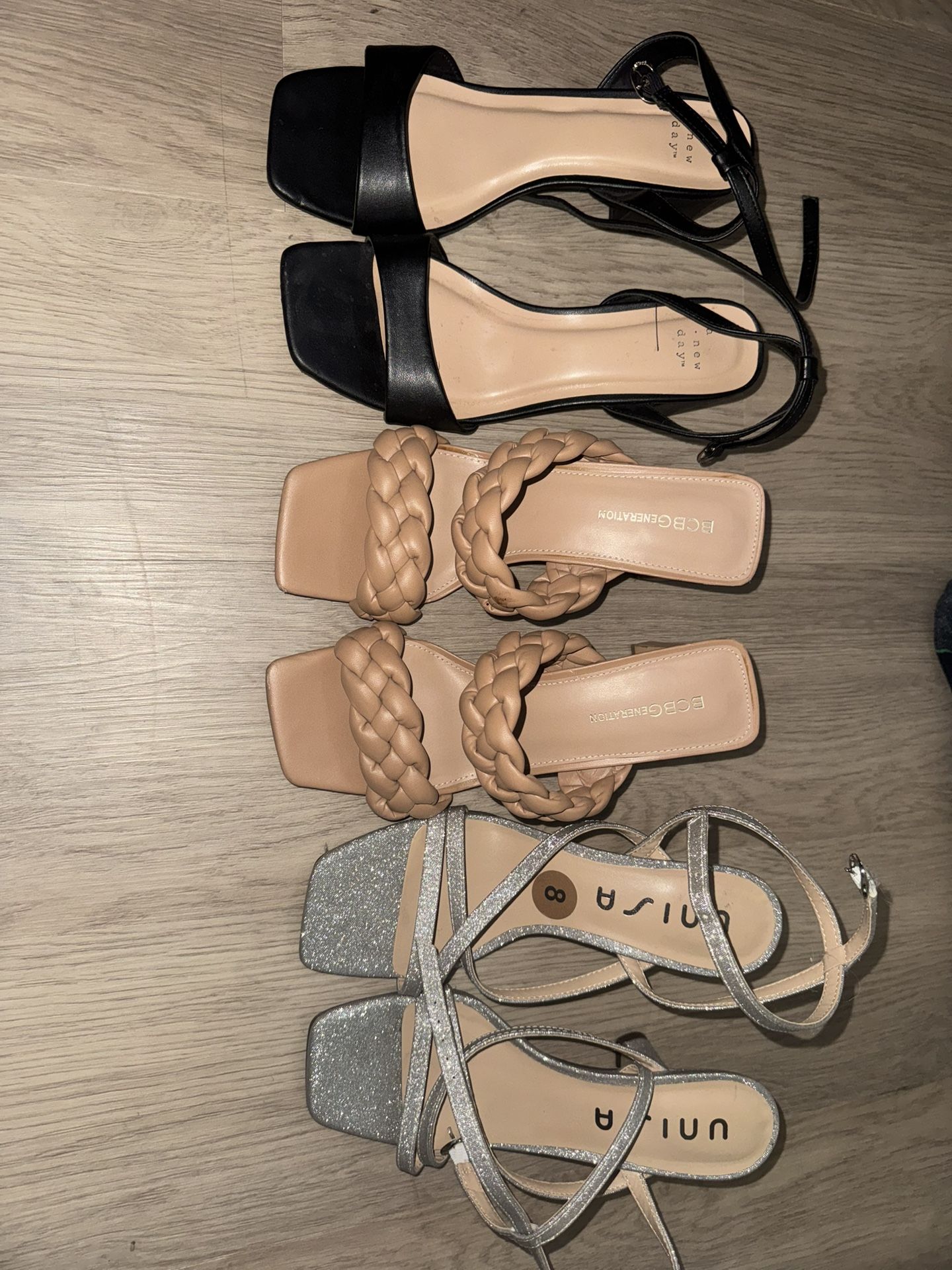 Black: 8 1/2 Tan: 8 1/2 Silver: 8 $10 each pair The heels are on the shorter side