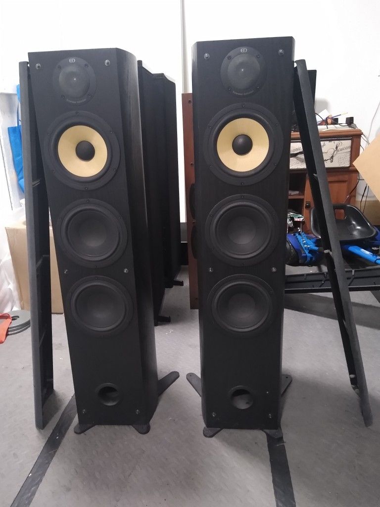 These speakers are very difficult to find and have a cult following due to their high quality drivers, including their 70 khz extended definition tweeters. The tower speakers are in good shape overall, besides a few scratches on the top of one of them, and the grill covers have a few imperfections and need some cleaning. They have a great, detailed sound to them. The center speaker is in great condition, with only some minor blemishes on the speaker stand that is made for this speaker, due to its curved shape.