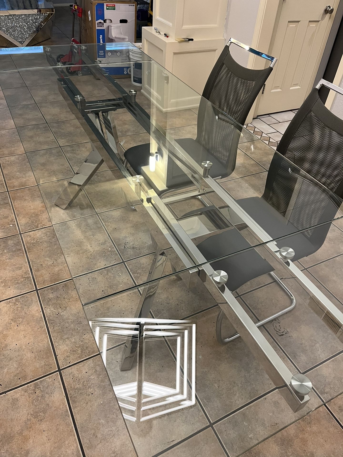 Brand new, modern, 6 chairs, ends of table slide in if needed to be shorter