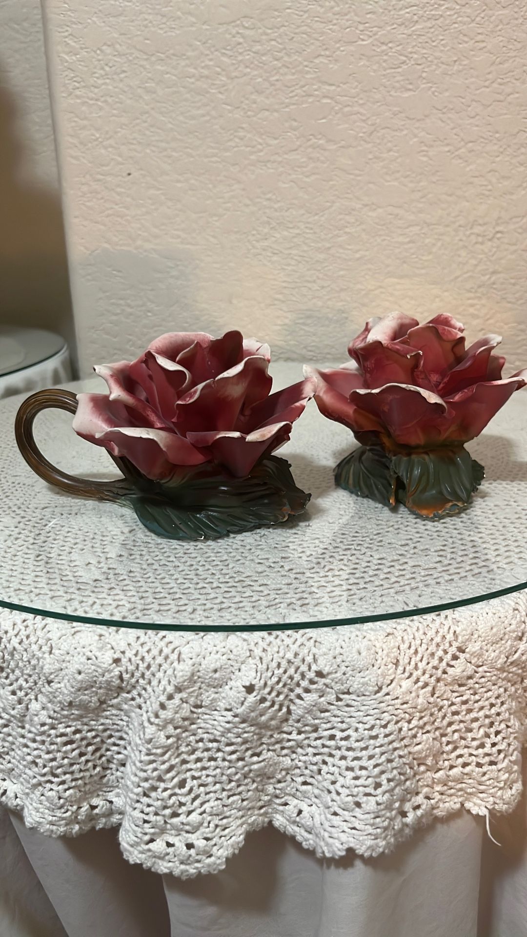 Pair of vintage red/pink rose shaped candle holders. - hand made and painted -in good condition; one rose has two petals repaired with glue. The other has a small chip at the base of one leafy. Not very noticeable. - resale sites list similar items for $15-$45 a piece. Asking for $25 for the pair.