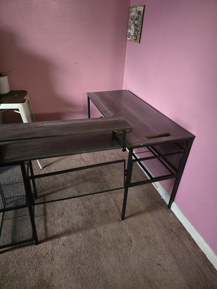 Reversible L-shaped Desk.... Gray faux wood.... Put it in just about any shape you like.... L-shape left or right OR Straight with attachment on left or right..... lots of Desk top room..... one shelf on top and 3 shelves underneath add even more space.... Top shelf has lights underneath it.... 5 plug receptical, (not shown in pics).... Hate to let it go, but moving into a tiny house and it just takes up too much space.... it's also considered a Gamers Desk.
