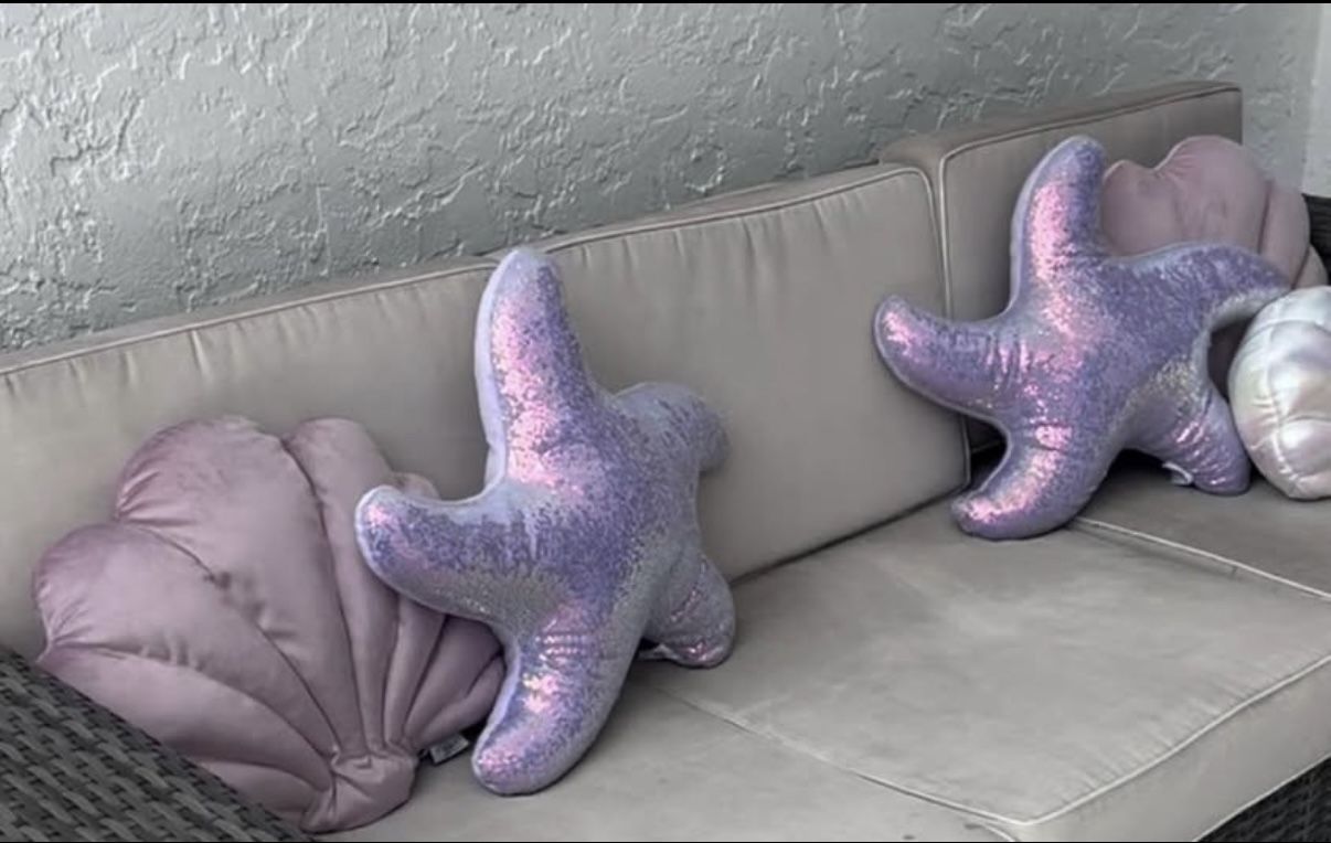 Stunning pillows No stains or damage 4 iridescent shells 2 purple starfish 2 purple shells Total 8 pillows