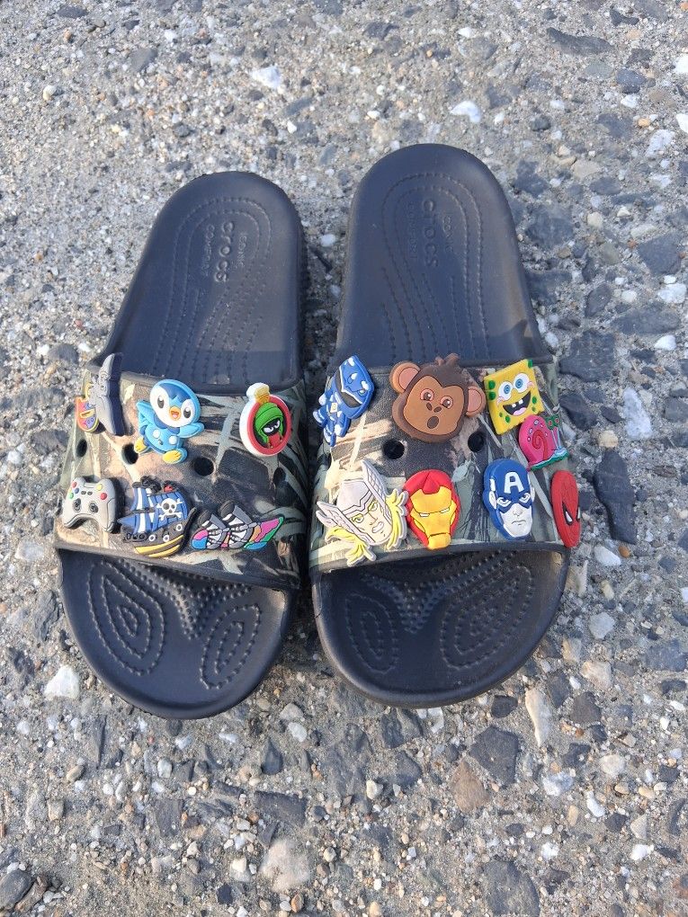 Crocs boys black sandals size 4 Jibbitz shoe charms included. Shows a unique charm of style. Unused, clean, and sanitized sandals. Ready for hot summer days, with a pair of easy slips in Crocs. Comfort fit.