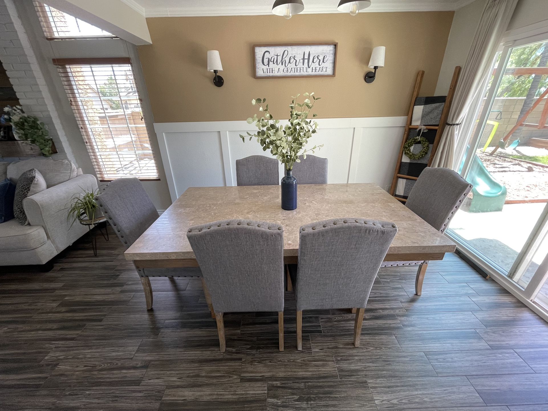 Good condition! Measurements in picture One of the chair legs is broken (see picture) and only kids use it to not support a lot of weight. Some of the chairs have minor stains.