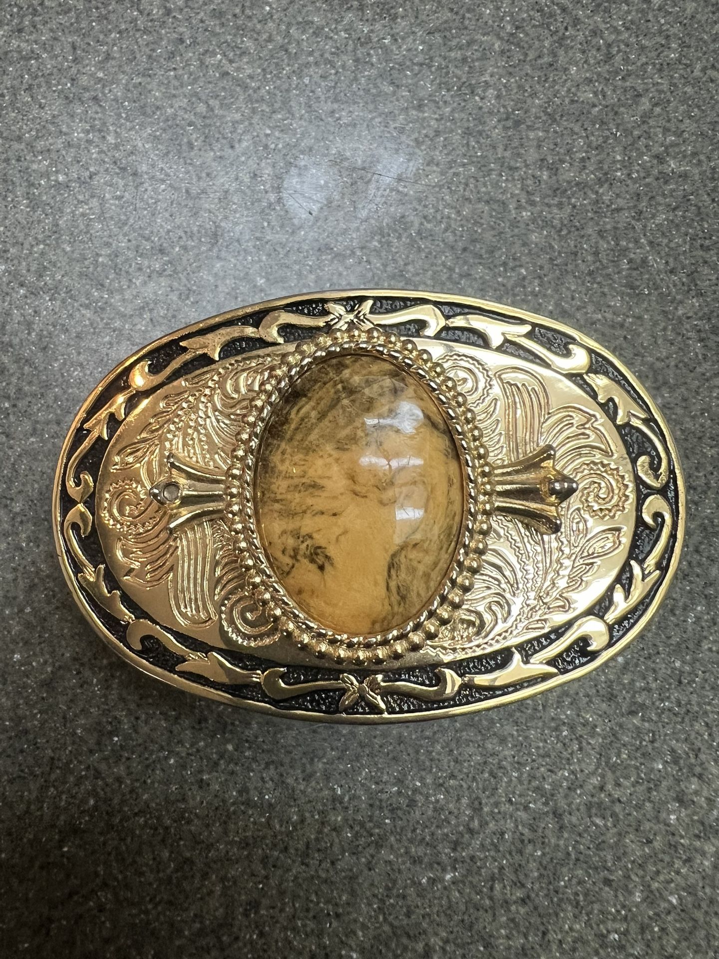 Vintage western-style belt buckle with a large picture jasper-look center stone (natural patterned stone). Gold-tone finish with decorative scroll details. Marked ZB-003 on the back. Great for cowboy/western outfits or collectors of vintage belt buckles. Condition: Good vintage condition with normal wear. NW Bakersfield pickup only
