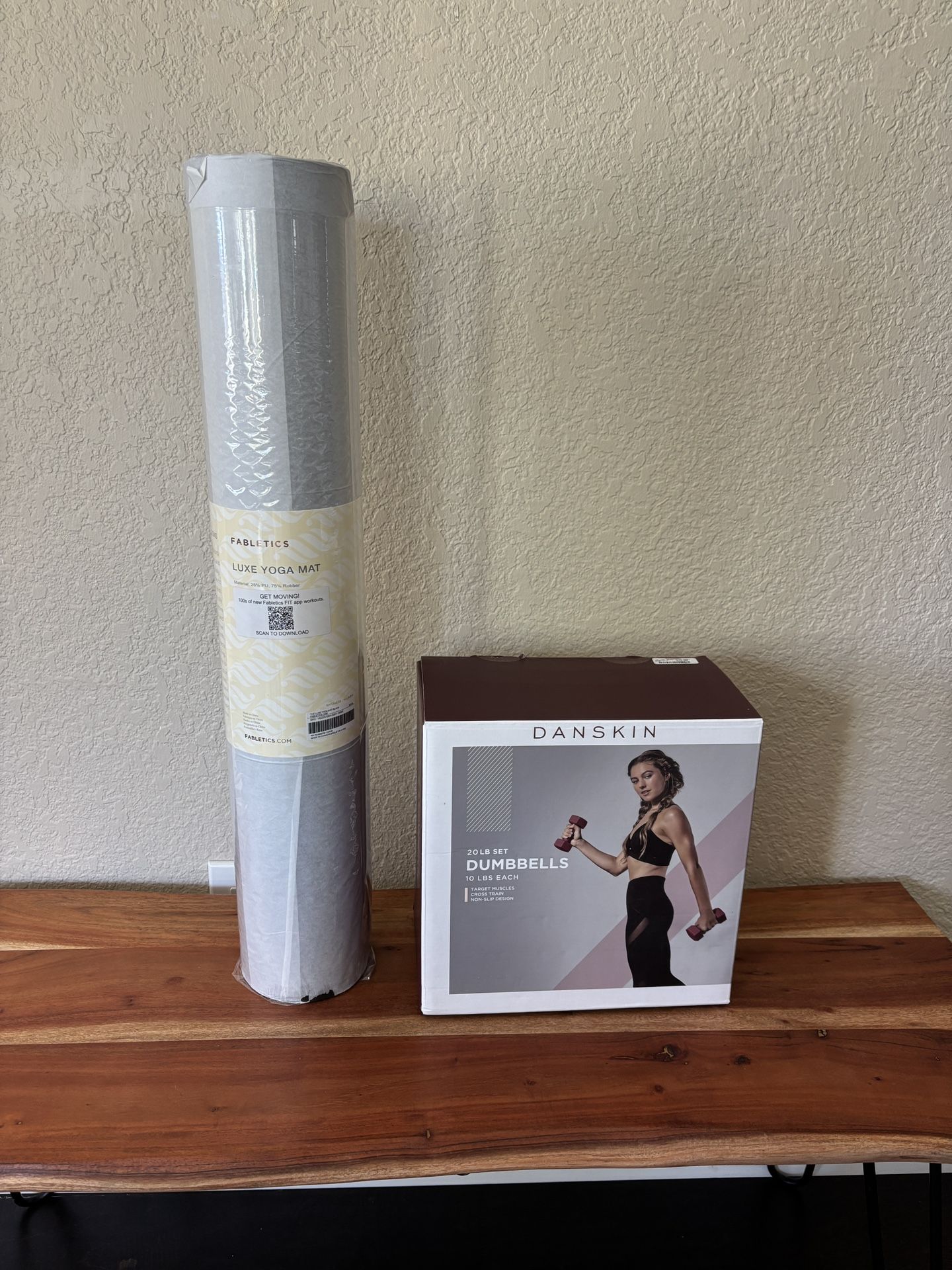 Brand new - fabletics yoga mat - 68.5 cm Brand new - danskin 10 lb dumbbell set Selling both for $55