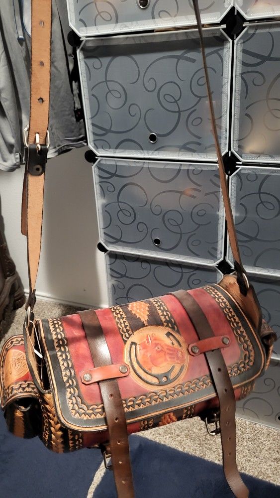 Never used, Handmade Leather Handbag. Two storage pouches on side of bag, bag closes securely with belt type fixtures. One of a kind - you'll never see another like this on the street as this was made by ancestors.