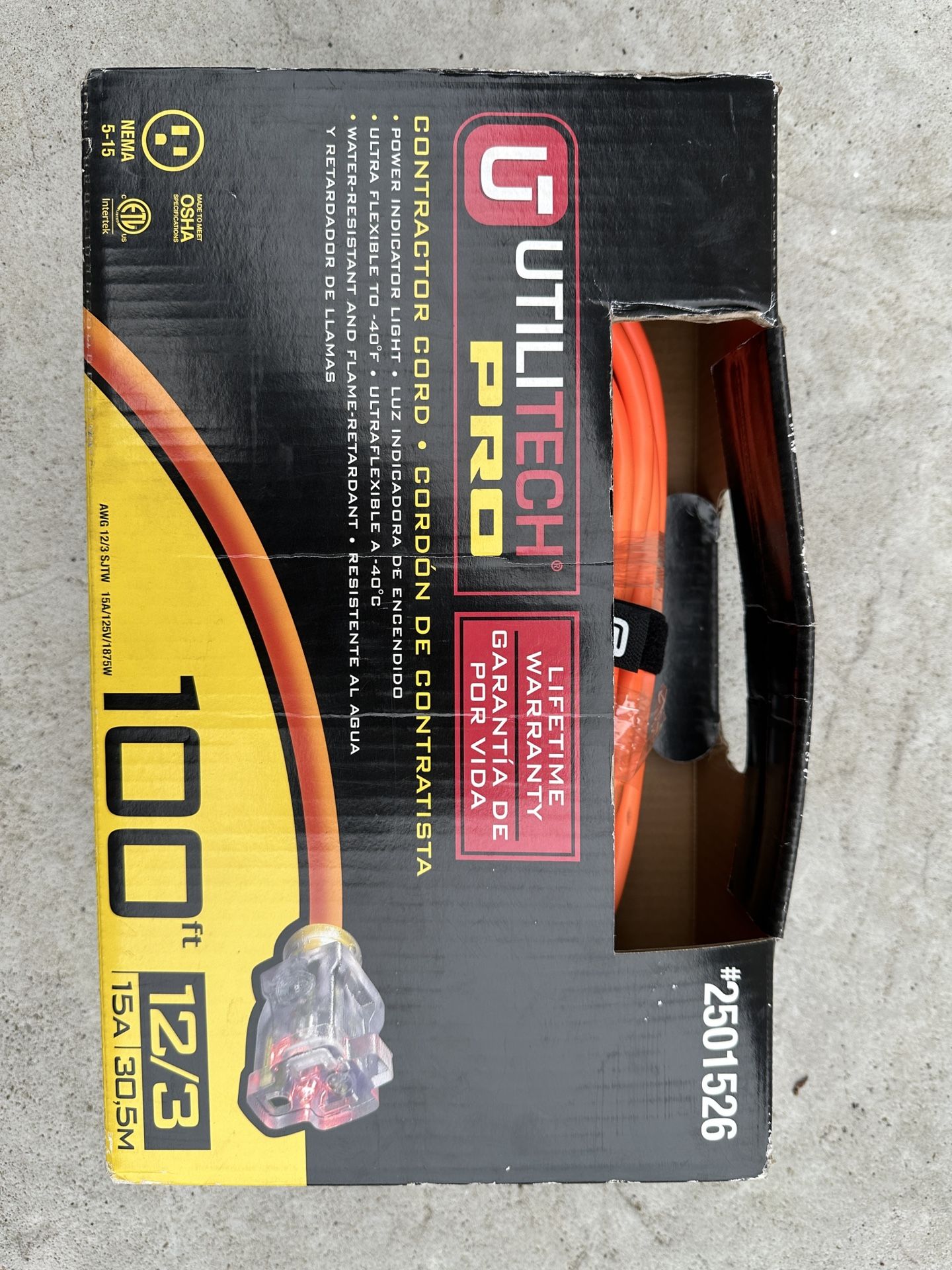 Extension Cord contractor cord 100 ft, 12/3 15A new in the box, it retails for $120+tax in store.