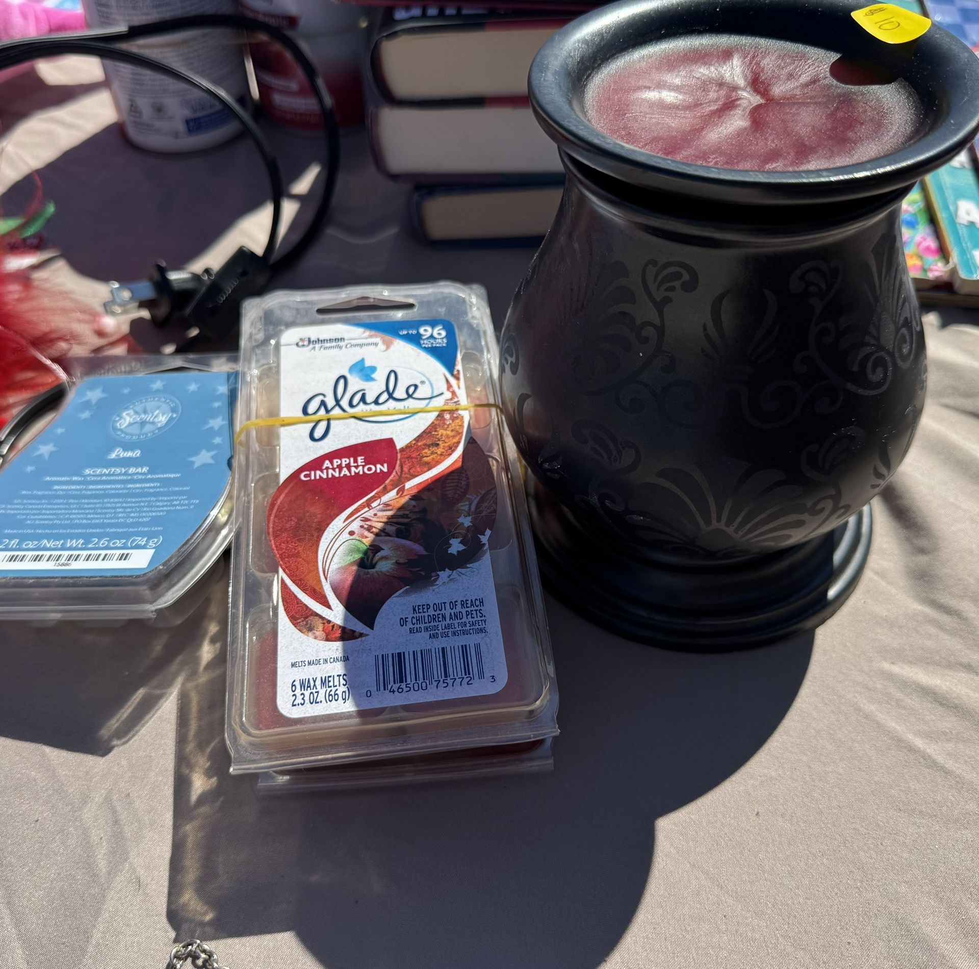 Wax metal warmer. Comes with wax melts, 1 new cinnamon, the other pack has a few of each used same with the scentsy bar a few used. Asking $10 for all cash only