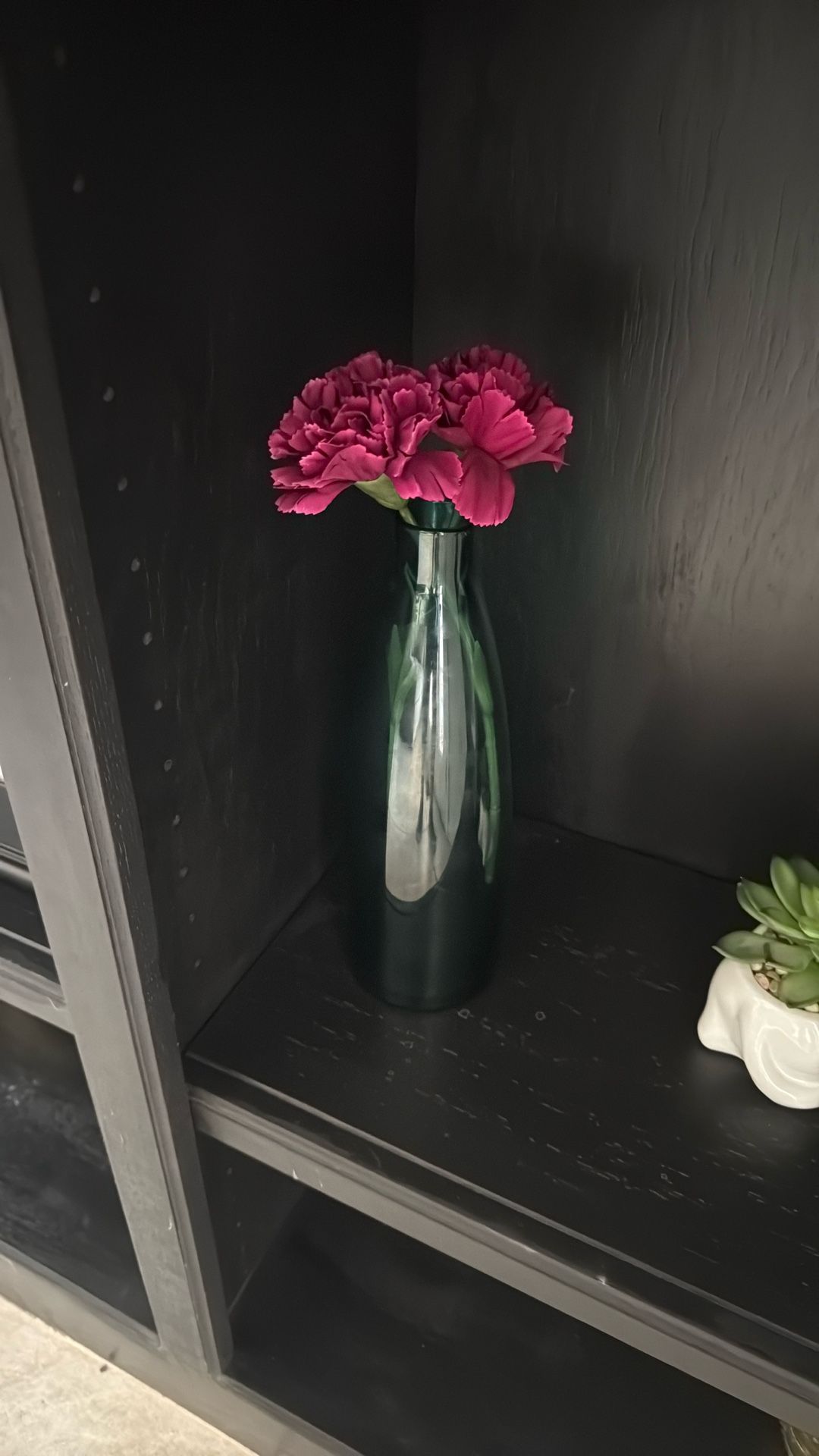 Turquoise tinted vase with 2 flowers