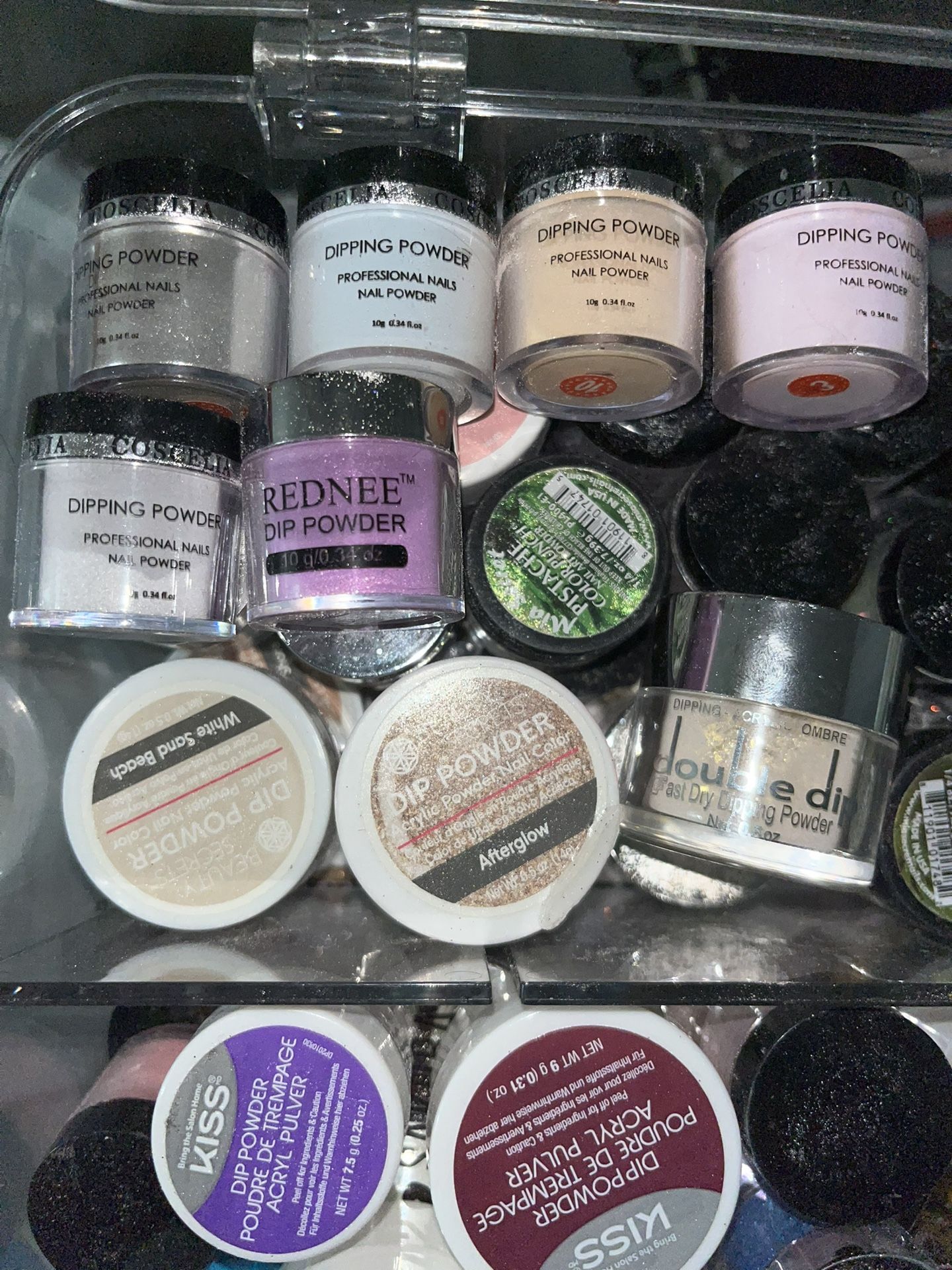 Collection of various nail dipping powders and acrylics including brands like REDNEE and KISS. Pick up only-by Dec 19th