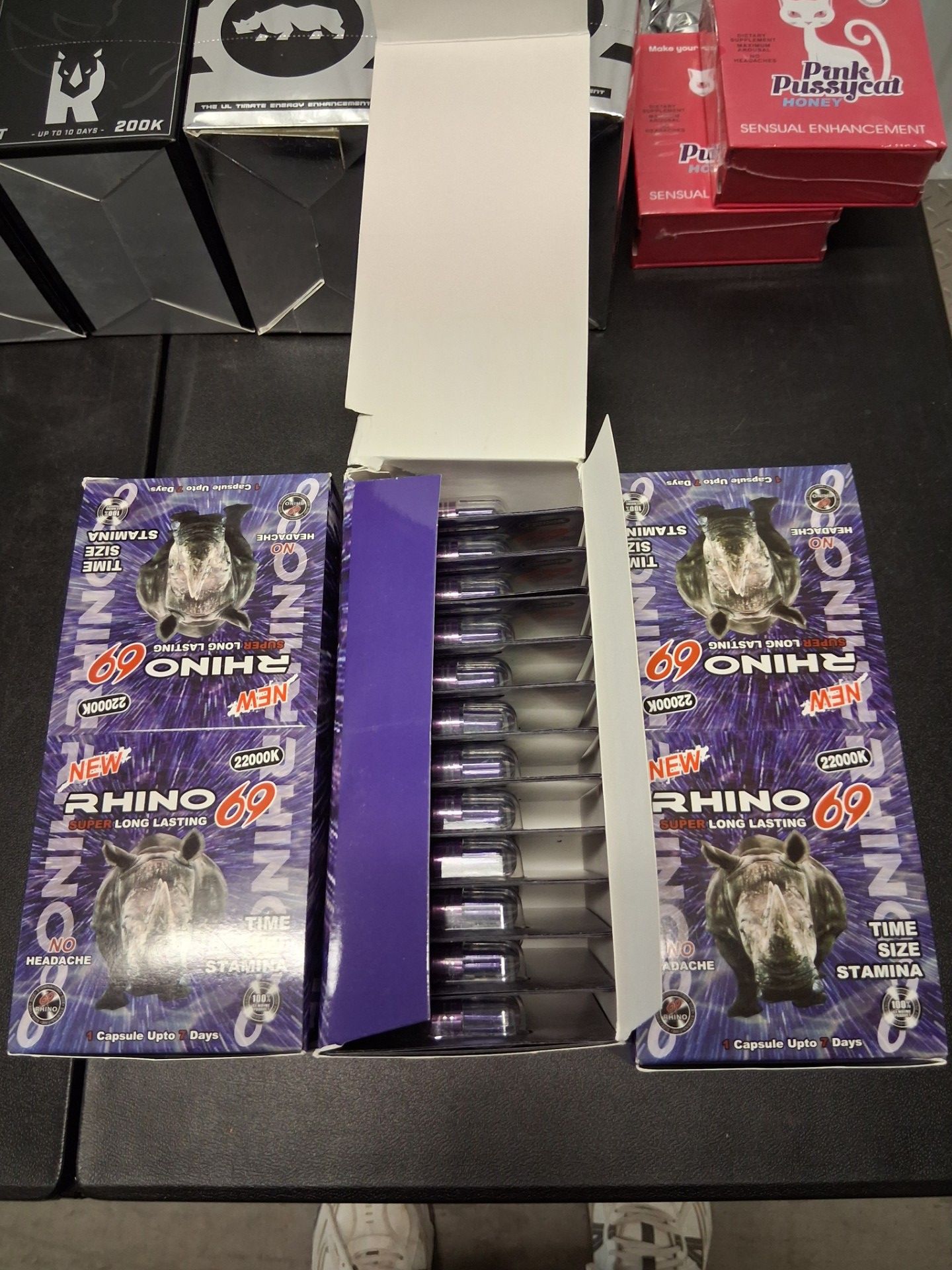 3 boxes of rhino 69 22000 2 boxes of maxfuel mango pineapple 2 boxes of 24k rhino shots 2 bpxes of rhino 8000 shot 2 boxes of rhino 69 shots