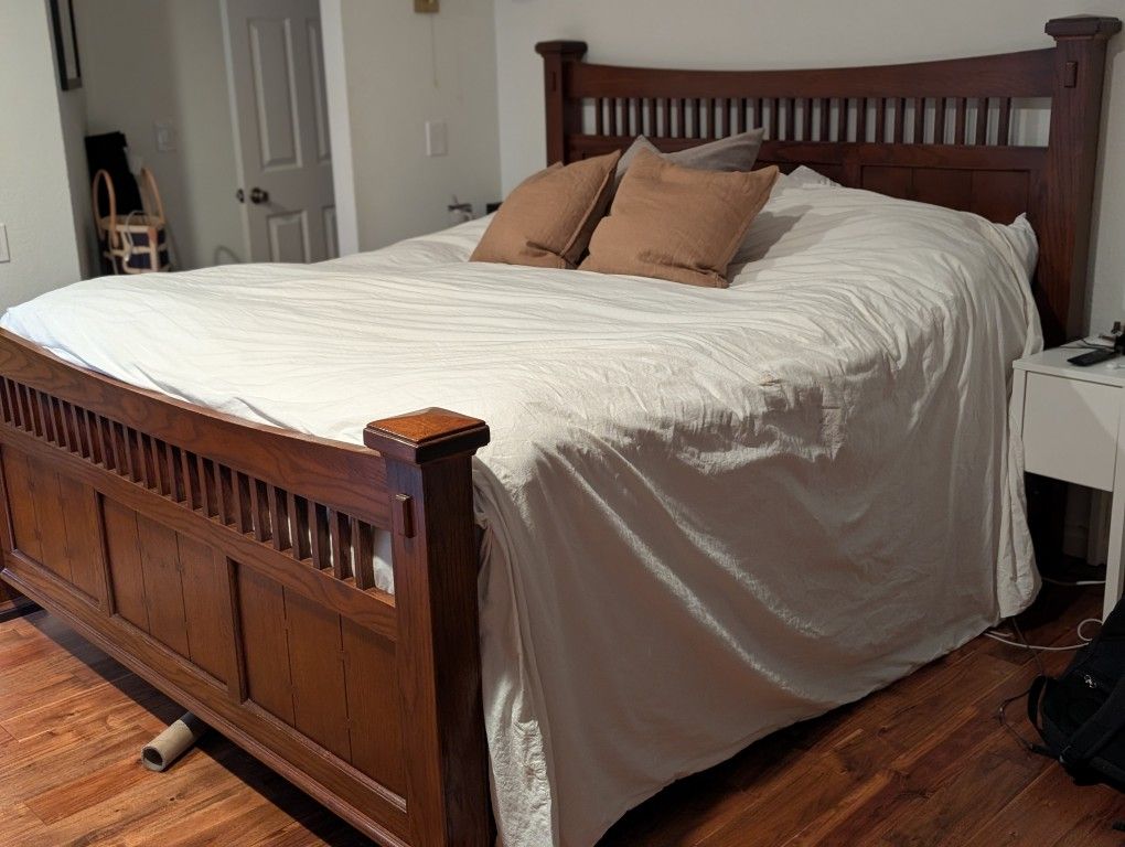 Will not respond to questions asking if it's available. Share when you can pick up and we can go from there Craftsman style bedroom set with two dressers, bedframe (mattress not included). Can include two matching nightstands. Will throw in a coffee table too. Redecorating so clearing things out, all furniture in good used shape. This is a great deal. Will not deliver, or answer a bunch of questions.