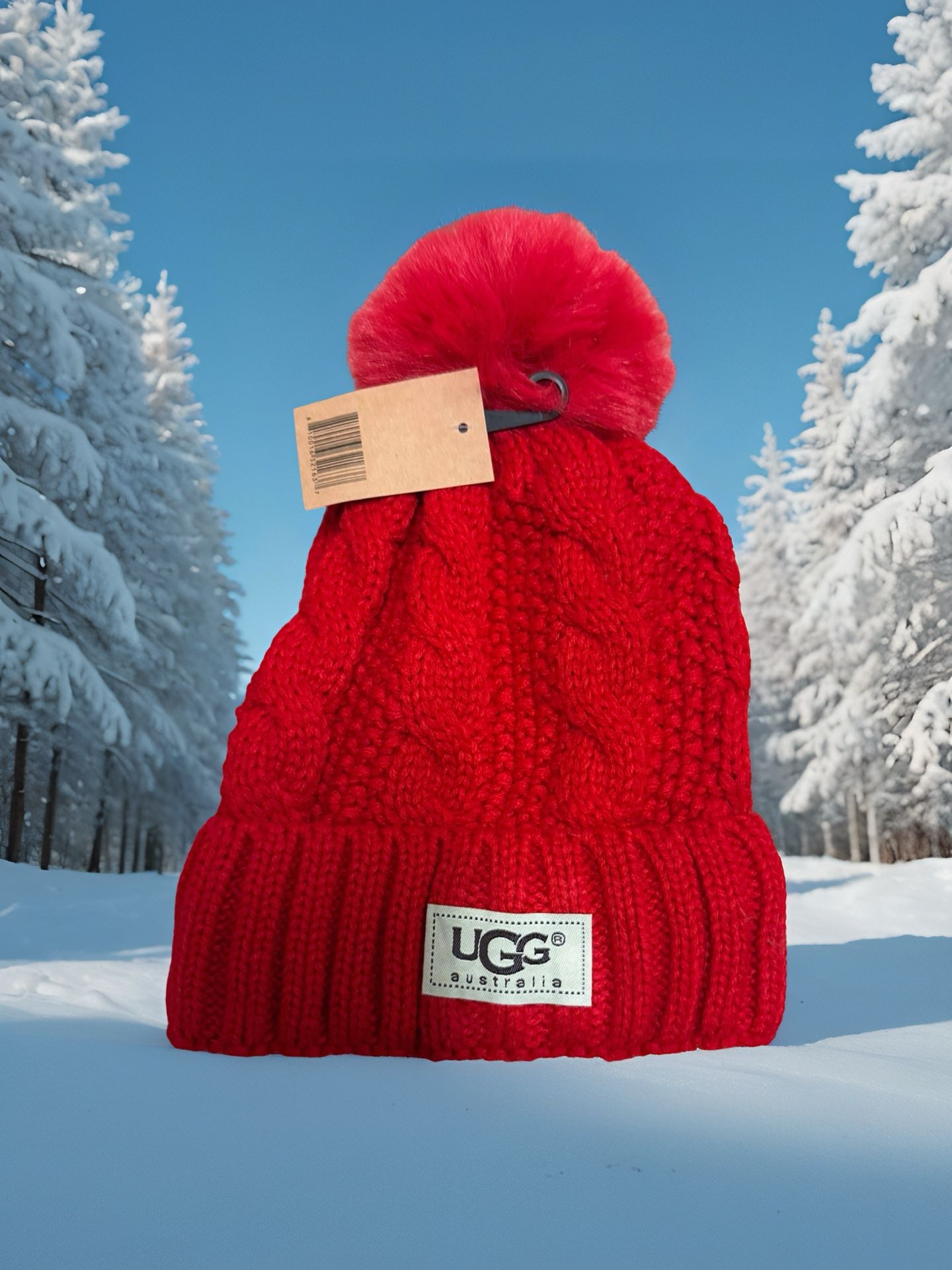 PPTT. The UGG Australia Cable Knit Red Beanie is a stylish and cozy accessory perfect for the colder seasons. Made with faux fur and fleece lining, this beanie is not only warm but also fashionable. The cable knit design adds a touch of texture and the signature UGG Australia logo adds a touch of luxury. Ideal for travel, activewear, or casual outings, this one-size beanie is a versatile and chic addition to any winter wardrobe.