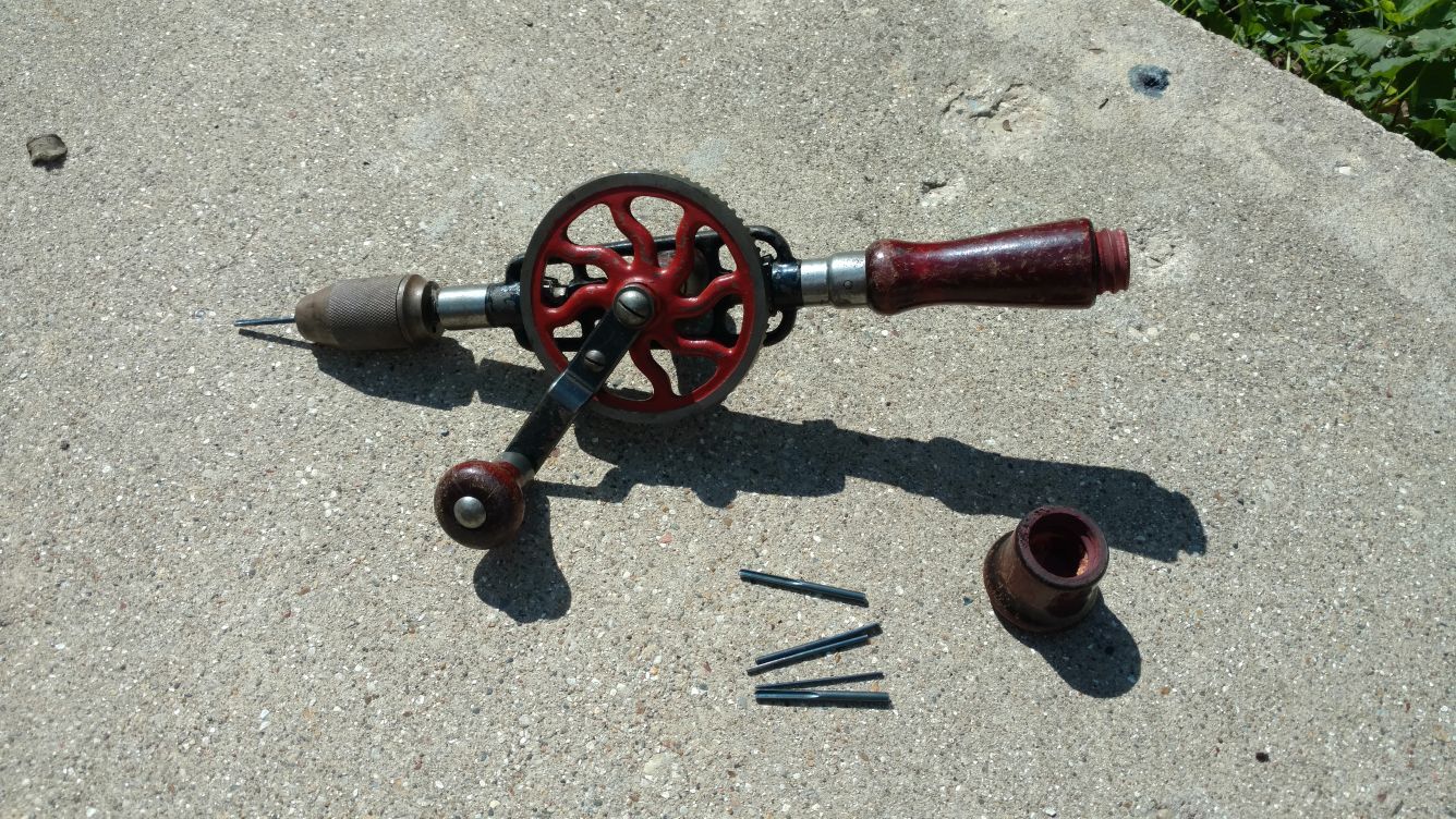 Vintage antique hand drill. A beautiful example of a vintage tool. Wooden handle unscrews to hold drill bits. This one "does" have side handle ( unlike one in picture that sold) works great, in very nice condition!
