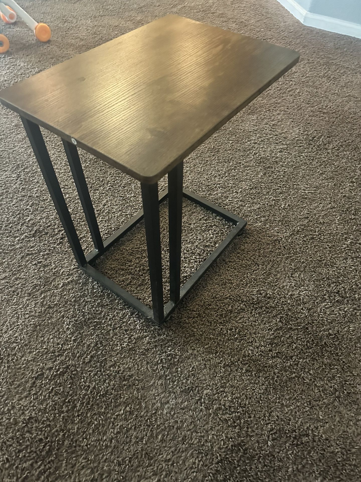 Sturdy modern side table with a wood-look top and black metal frame. Great as an end table, accent table, or small desk for a laptop. Minimalist/industrial style that fits well in living rooms, bedrooms, or offices. Good condition with normal light wear. Solid and stable.