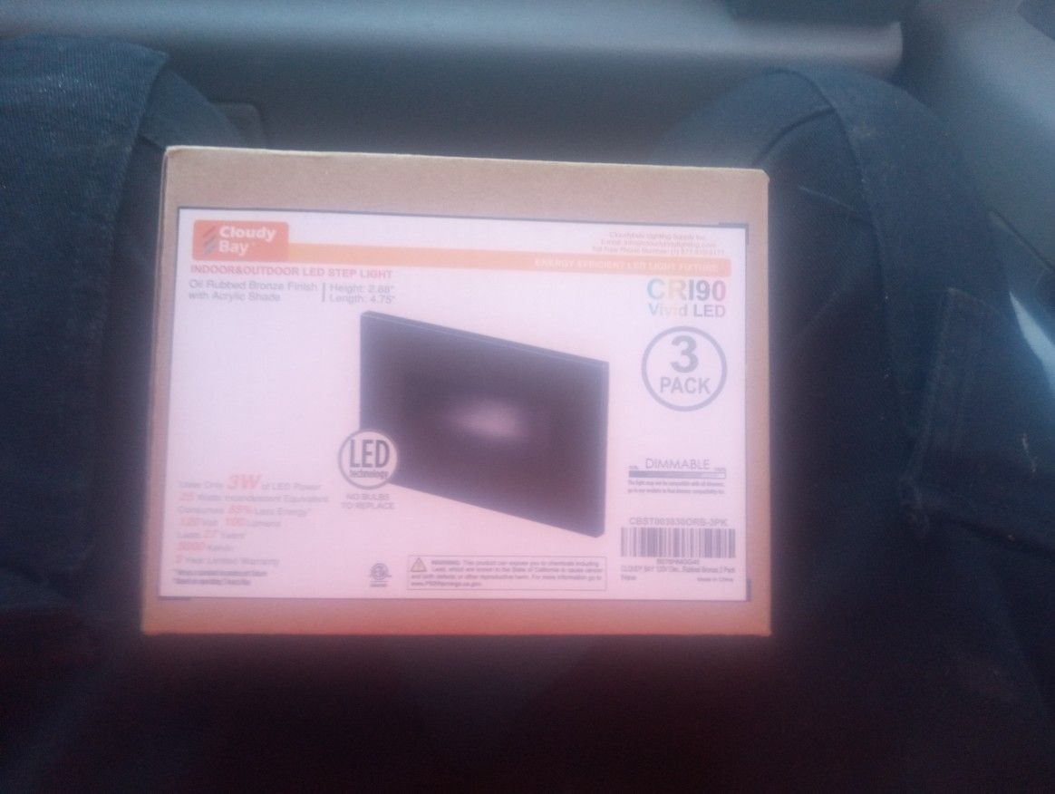 In brand new condition in box never opened, Indoor/Outdoor Led Step Lights,Oil rubbed bronze finish with acrylic shade height 2.88, length 4.75, 3 in a pack CRI90 Vivid Led.