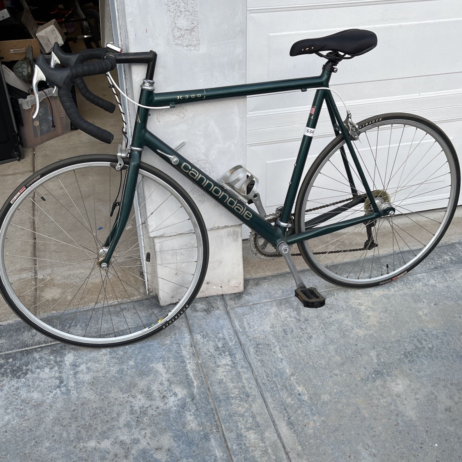 Cannondale R300 racing bike. Forest green, made in the USA. Speedometer, clip on pedals