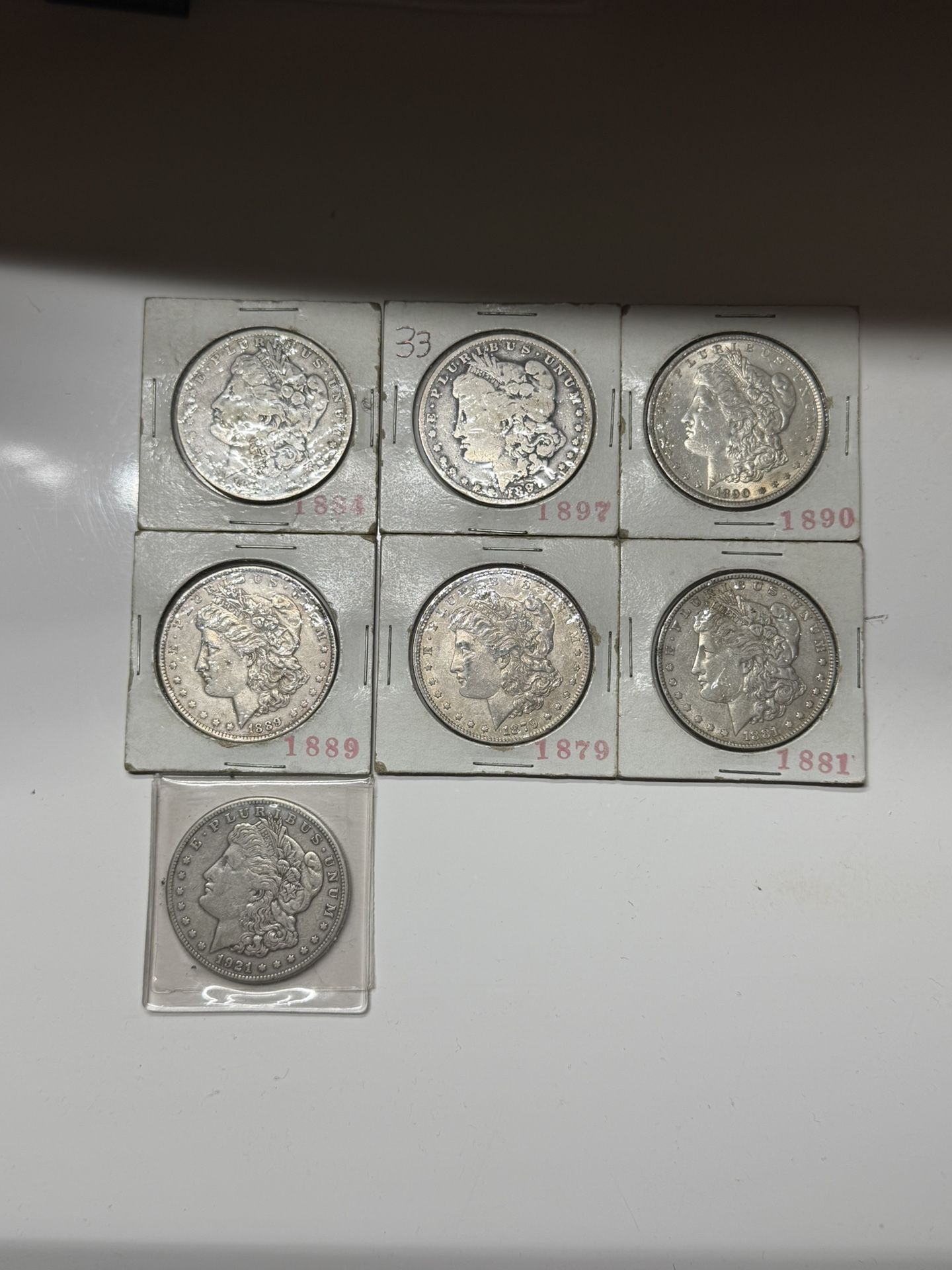 7 Morgan coins - $400 6 Kennedy half dollars -$100 3 Franklin half dollars - $100