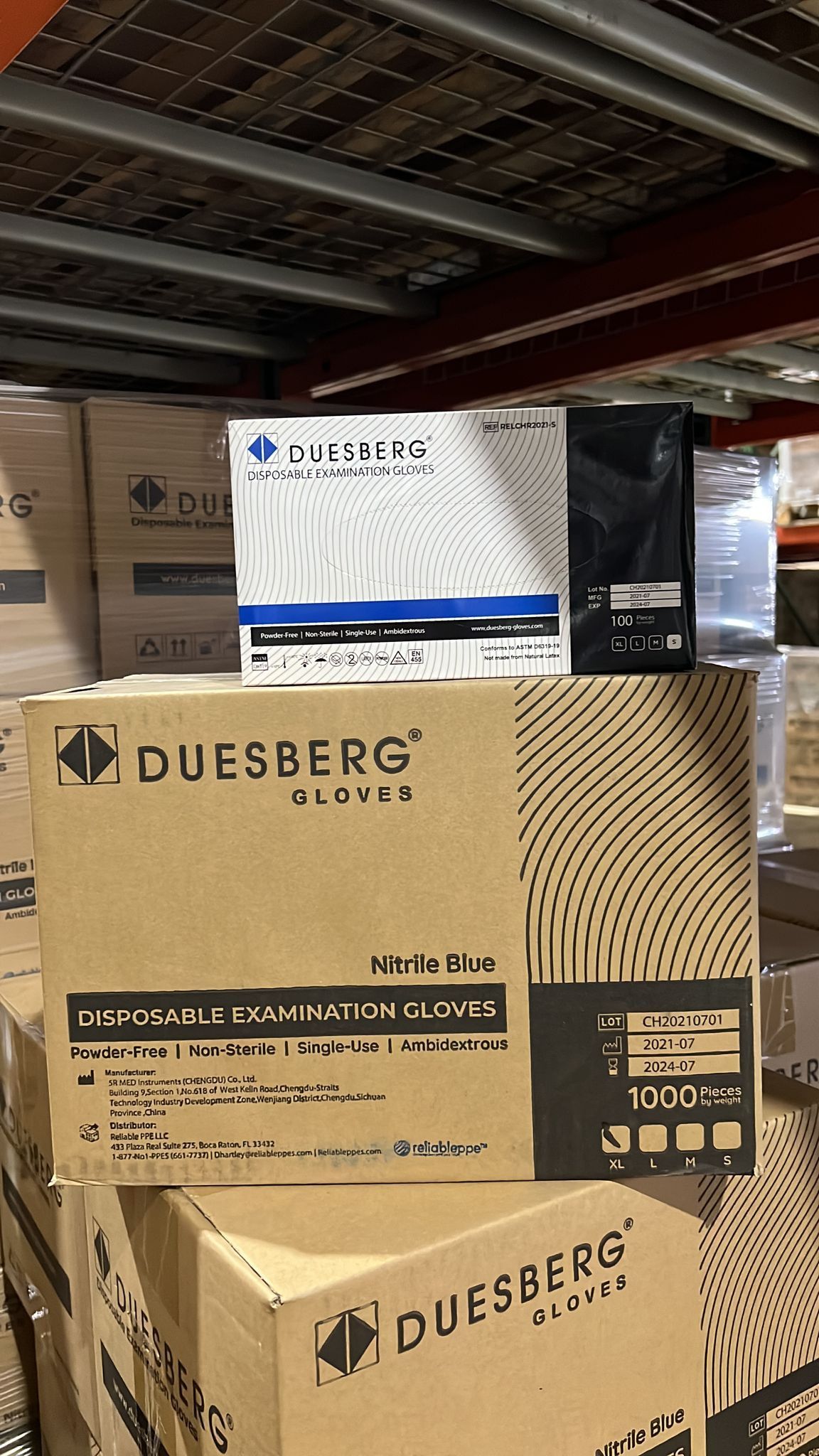 Duesberg Nitrile Blue Gloves Sizes Medium and Large. Box of 100, master case brings 10 boxes. 1000 gloves per master case. Price is $5/Box $50 master case Sold as master case