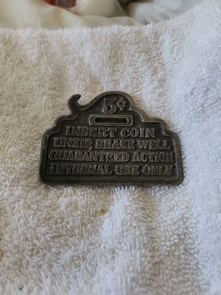 Silver Belt Buckle With The Slogan " 5 Cents Insert Coin Unzip, Shake Well Guaranteed Action. Internal Use Only