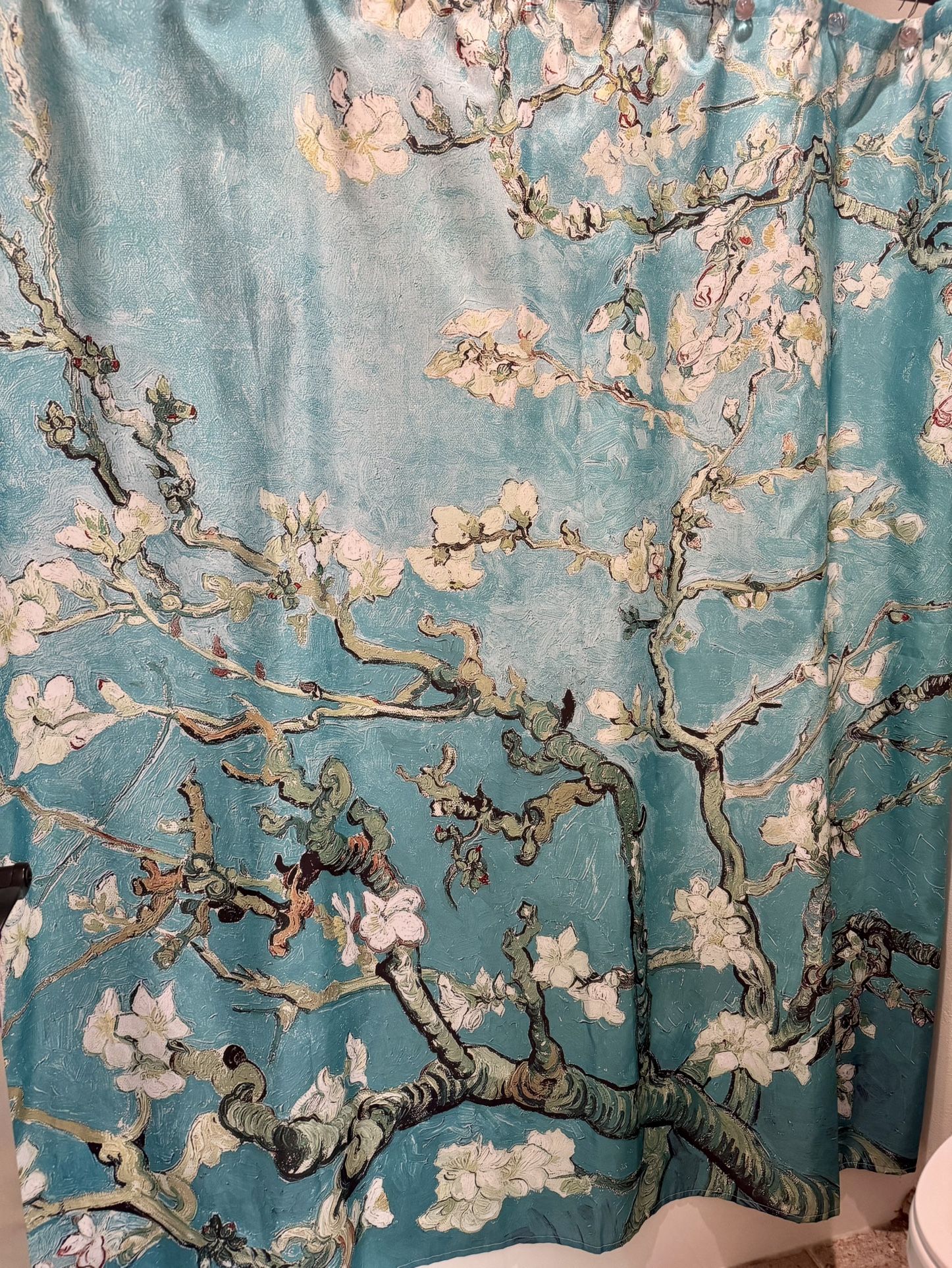 Teal tree and floral shower curtain. Good condition overall. Shower hooks not included.