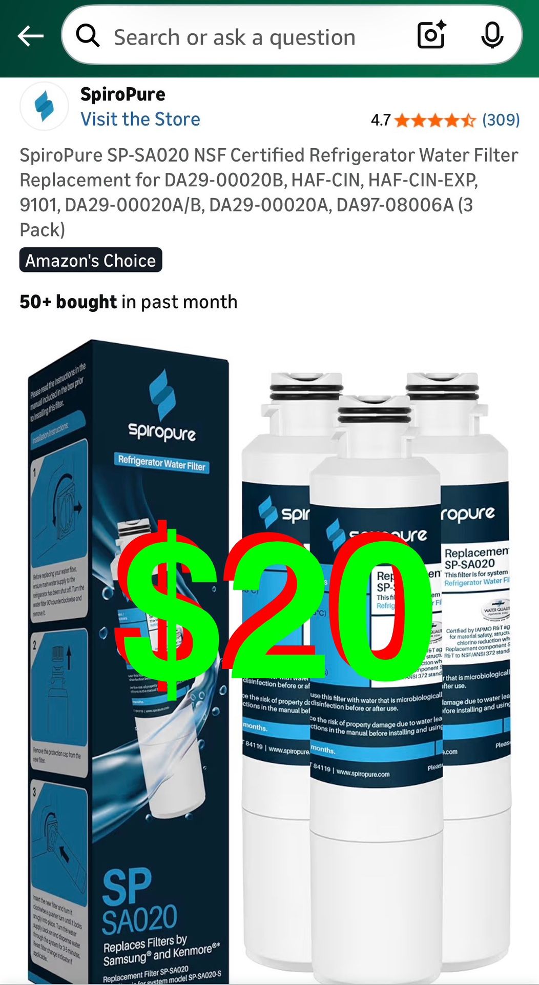 SpiroPure SP-SA020 NSF Certified Refrigerator Water Filter Replacement for DA29-00020B, HAF-CIN, HAF-CIN-EXP, 9101, DA29-00020A/B, DA29-00020A, DA97-08006A (3 Pack)