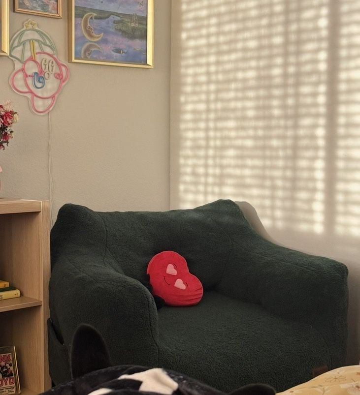 35"D x 37"W x 31"H Deep Green Accent Chair Sherpa Material Has pockets on both sides Like new, it was too big for my room unfortunately