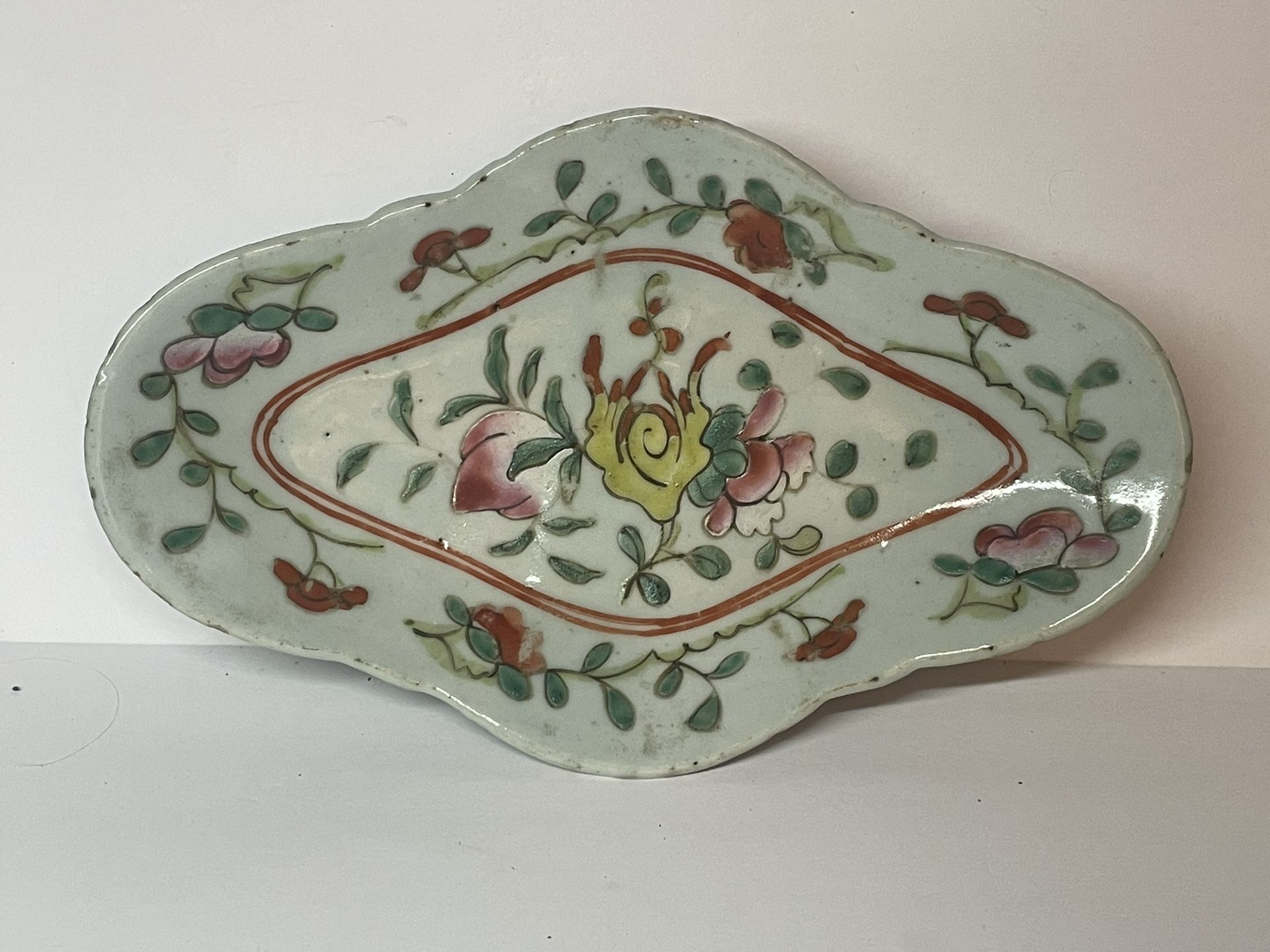 Antique Chinese Porcelain Famille Rose scalloped/Lozenge footed dish 7”