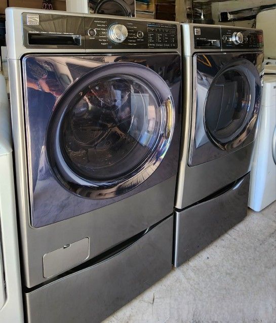 Nice and clean Kenmore elite front load washer and gas dryer heavy duty super capacity both working great clean in n out energy star matching set with pedestals both in great conditions Hablo español