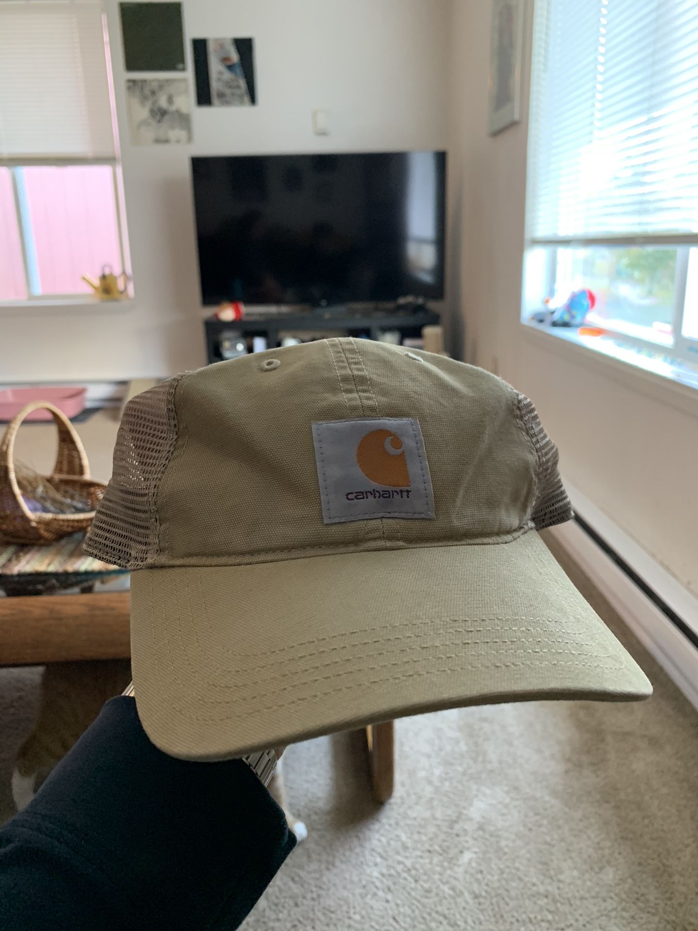 Brand new, has a stain on the logo for some reason, but nothing else. Feels nice and comfortable, breathable trucker hat.