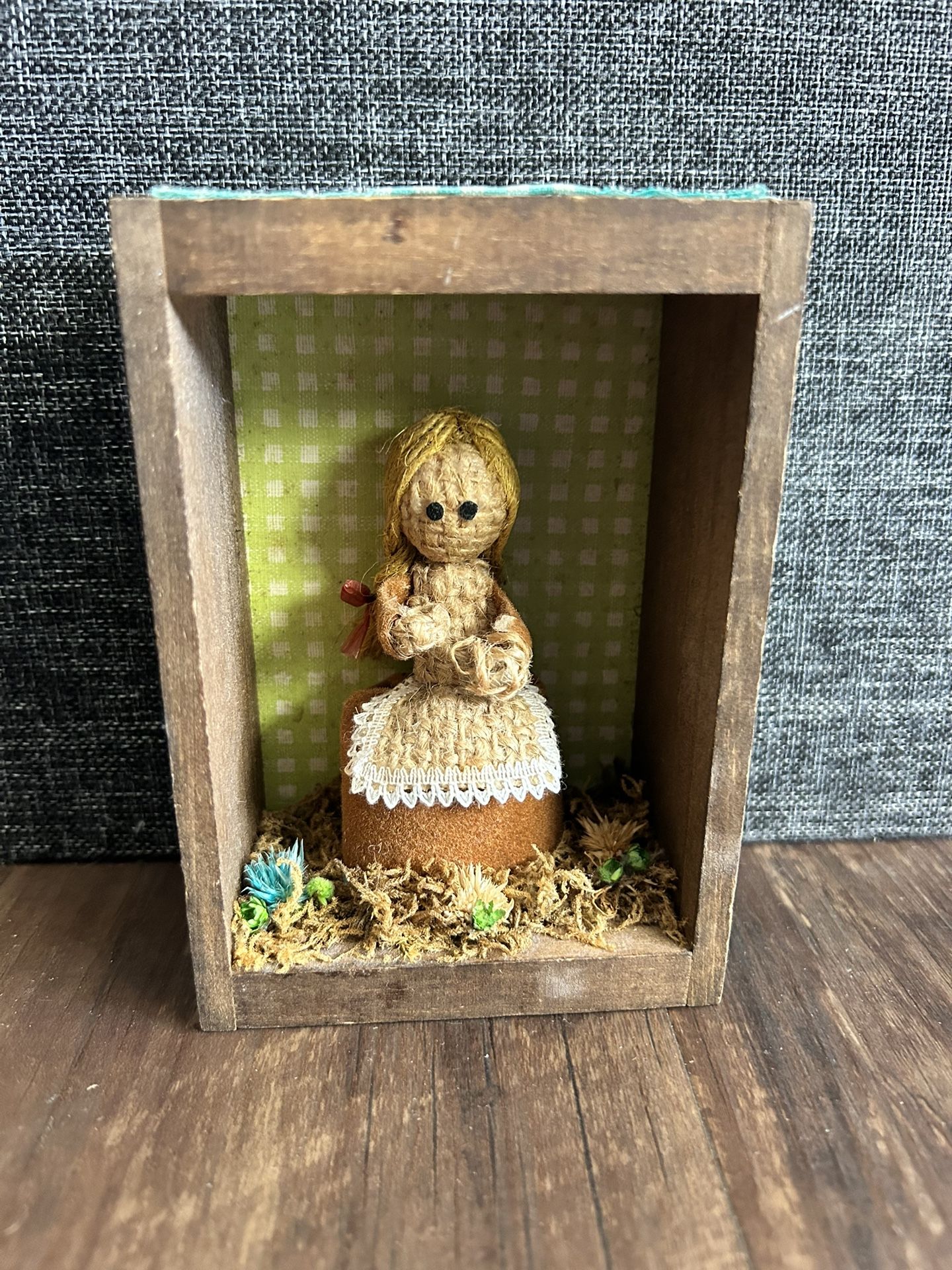 This is a folk art diorama featuring a handmade doll. The doll appears to be made from burlap or a similar woven material with yarn hair and sewn facial features. The diorama is housed in a small wooden box and includes a miniature scene with moss and other decorative elements. Similar handmade dolls and folk art dioramas are often sold online through various retailers. These types of crafts can be a hobby or a form of regional folk art, sometimes associated with specific cultures or historical periods.