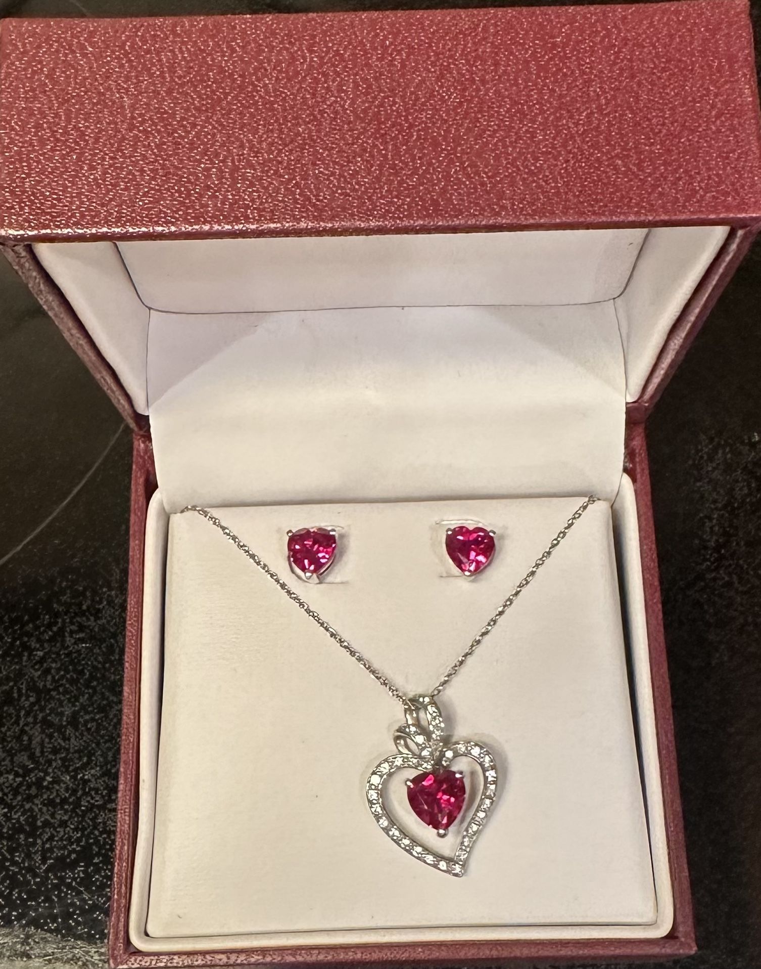 Ruby and White Sapphire Sterling silver Heart necklace and earrings