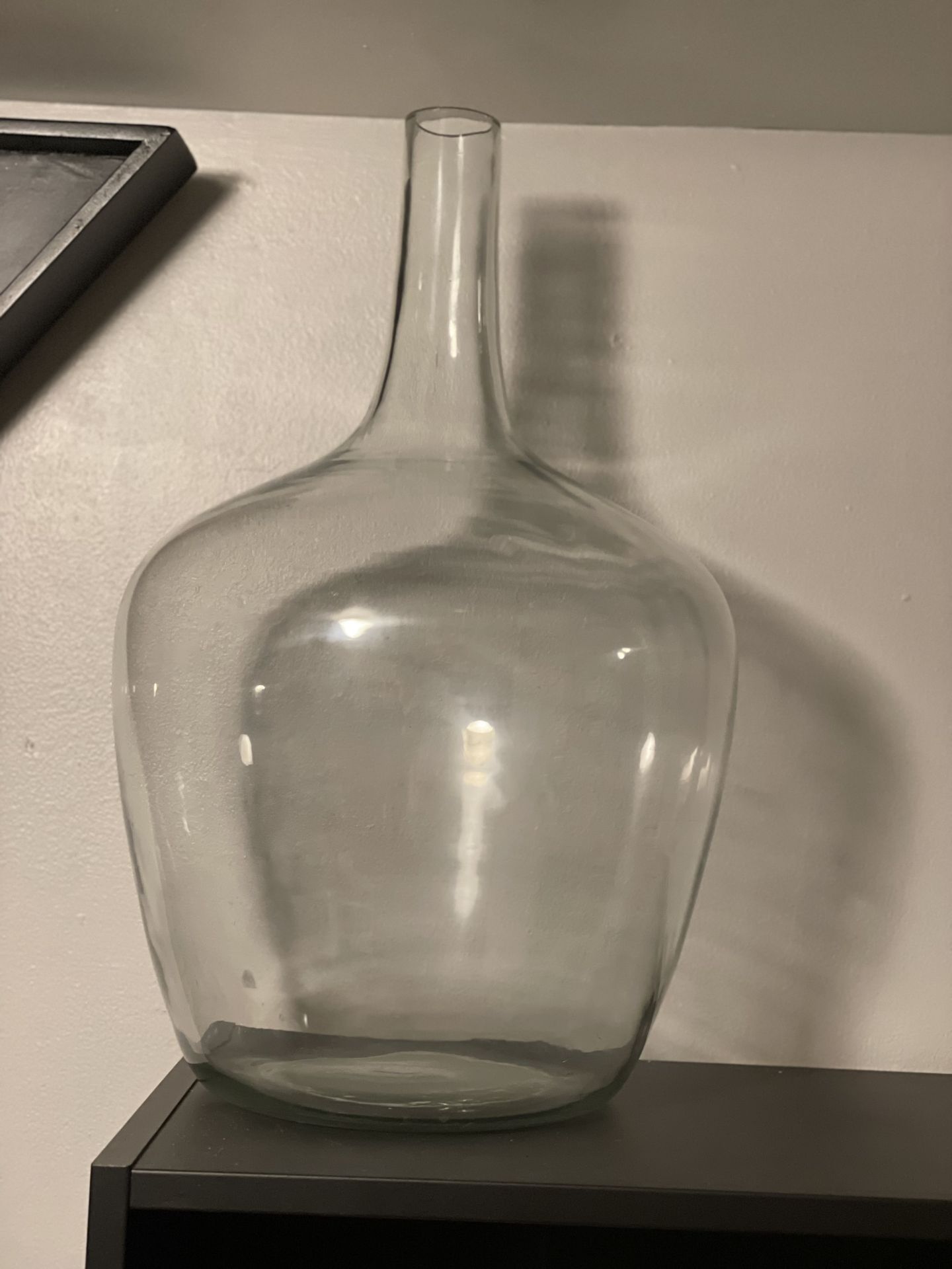 This clear, bulbous glass vessel is a demijohn style vase, a popular choice for farmhouse and minimalist decor. These vases are characterized by their wide, rounded bodies and narrow necks, often used to disgplay long-stemmed flowers, dried pampas grass, or even string lights. Does not come with long stem branches would be fo cute with lights too !!! Serene Spaces Living Glass Bottle Vase: A curvy bottle vase with a short slim neck Will meet In shoreline or Camano