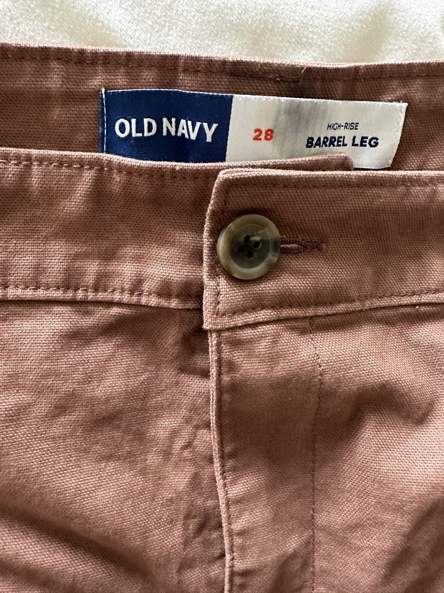 Never worn old navy High Rise Barrel leg rust brown size 28 told that’s a 4x cavas pant. Front slant pocket. Back pockets sewn sticking down front for a very nice clean look. These pants are soft to touch. Tag still on . Never worn. No stains no smells. Waist 54,length from crotch 25 1/2, bottom of pant 21 around. Asking $25. Cash or Venmo, no trades. Pick up only near 28 & East Burnside. No delivery, shipping. Will take serious offers only. Thank you for looking. Please check my other posts. I have a pair of high top converse with the same color.